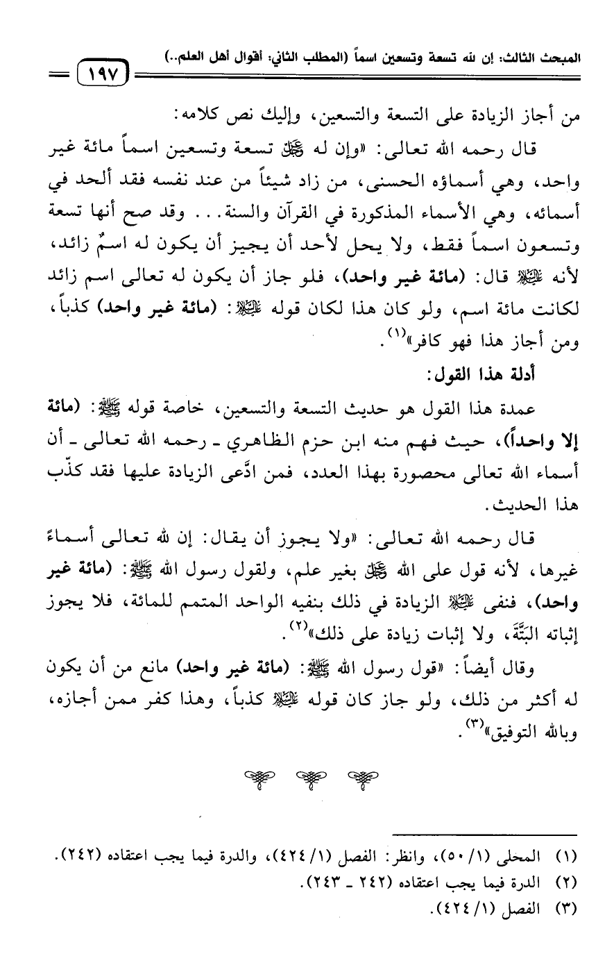 قال رحمه الله تعالى: "وإن له عزَّ وجلَّ تسعة وتسعين اسمًا مائة غير واحد، وهي أسماؤه الحسنى، من زاد شيئًا من عند نفسه فقد ألحد في أسمائه، وهي الأسماء المذكورة في القرآن والسنة ... وقد صح أنها تسعة وتسعون اسمًا فقط، ولا يحل لأحد أن يجيز أن يكون له اسمٌ زائد، لأنه عليه السلام قال: (مائة غير واحد)، فلو جاز أن يكون له تعالى اسم زائد لكانت مائة اسم، ولو كان هذا لكان قوله عليه السلام: (مائة غير واحد) كذبًا، ومن أجاز هذا فهو كافر" (¬١).