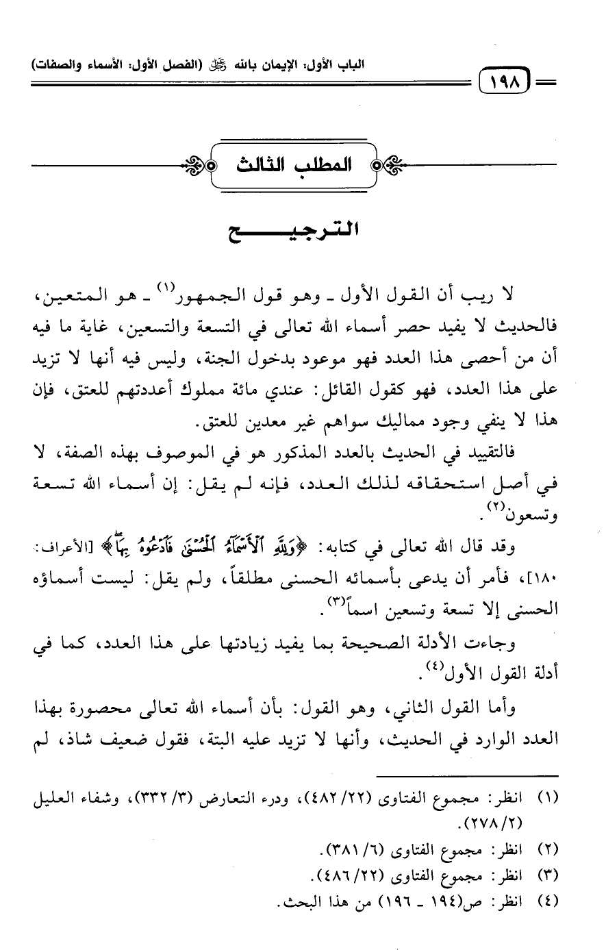 لا ريب أن القول الأول -وهو قول الجمهور (¬١) - هو المتعين، فالحديث لا يفيد حصر أسماء الله تعالى في التسعة والتسعين، غاية ما فيه أن من أحصى هذا العدد فهو موعود بدخول الجنة، وليس فيه أنها لا تزيد على هذا العدد، فهو كقول القائل: عندي مائة مملوك أعددتهم للعتق، فإن هذا لا ينفي وجود مماليك سواهم غير معدين للعتق.