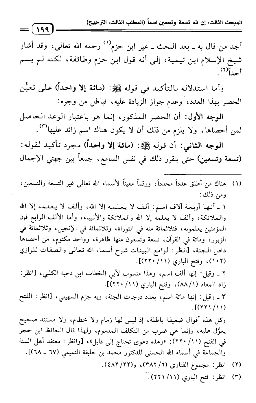 الوجه الأول: أن الحصر المذكور، إنما هو باعتبار الوعد الحاصل لمن أحصاها، ولا يلزم من ذلك أن لا يكون هناك اسم زائد عليها (¬٣).