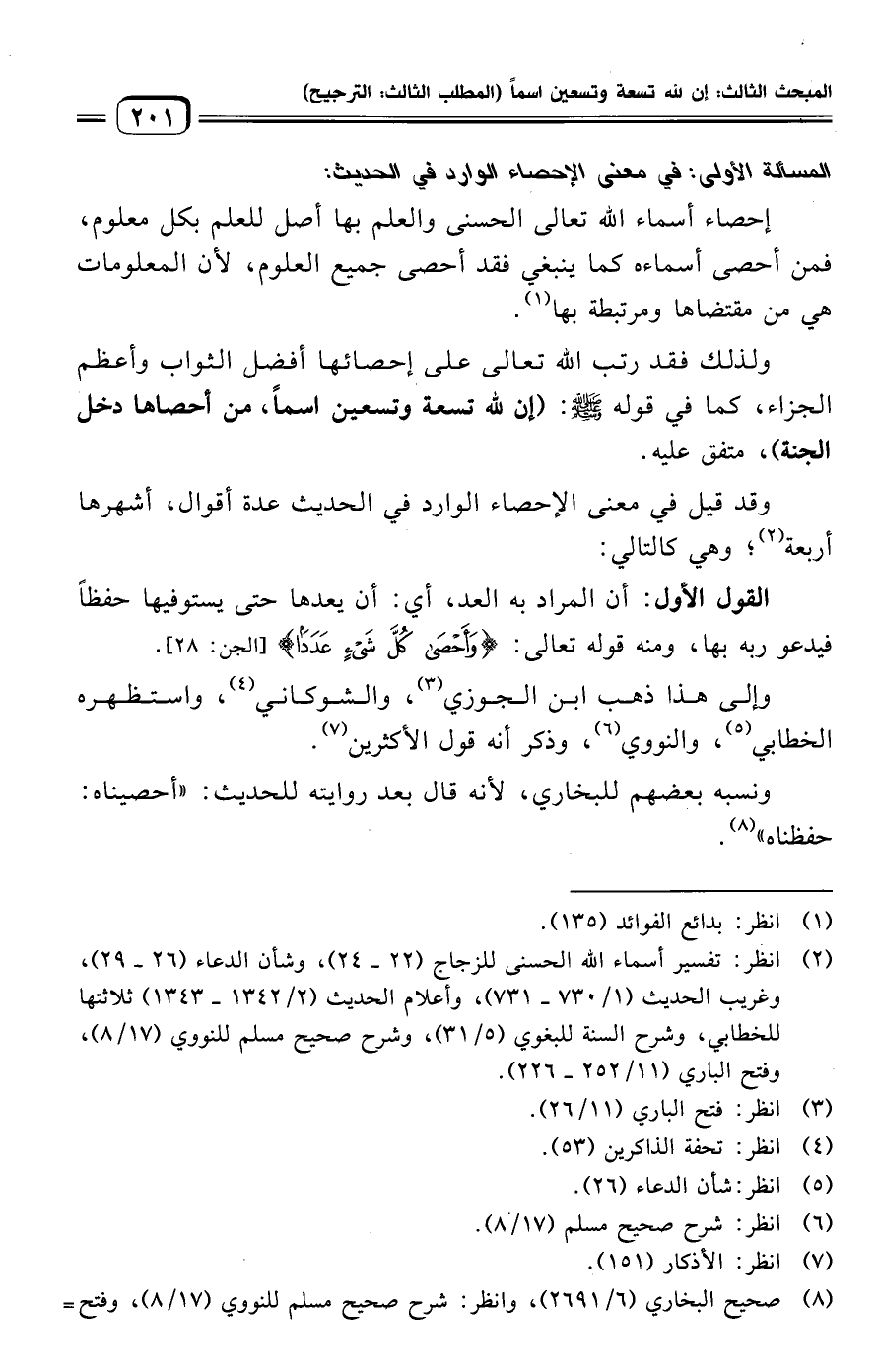 المسألة الأولي: في معنى الإحصاء الوارد في الحديث: