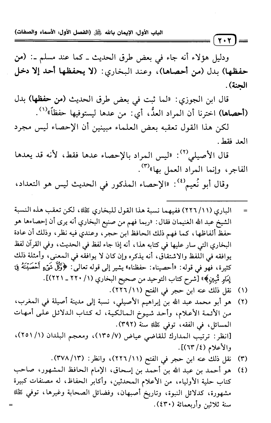 = الباري (١١/ ٢٢٦) ففيهما نسبة هذا القول للبخاري -رحمه الله-، لكن تعقب هذه النسبة الشيخ عبد الله الغنيمان فقال: "ربما فهم من صنيع البخاري أنه يرى أن إحصاءها هو حفظ ألفاظها، كما فهم ذلك الحافظ ابن حجر، وعندي فيه نظر، وذلك أن عادة البخاري التي سار عليها في كتابه هذا، أنه إذا جاء لفظ في الحديث، وفي القرآن لفظ يوافقه في اللفظ والاشتقاق، أنه يذكره وإن كان لا يوافقه في المعنى، وأمثلة ذلك كثيرة، فهو في قوله: "أحصيناه: حفظناه" يشير إلى قوله تعالى: {وَكُلَّ شَيْءٍ أَحْصَيْنَاهُ فِي إِمَامٍ مُبِينٍ} " [شرح كتاب التوحيد من صحيح البخاري (١/ ٢٢٠ - ٢٢١)].
