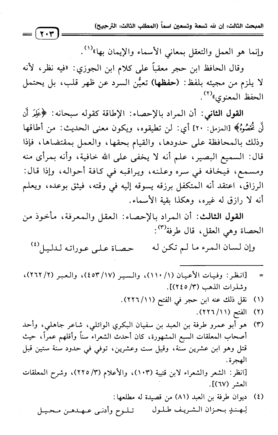 القول الثالث: أن المراد بالإحصاء: العقل والمعرفة، مأخوذ من الحصاة وهي العقل، قال طرفة (¬٣):