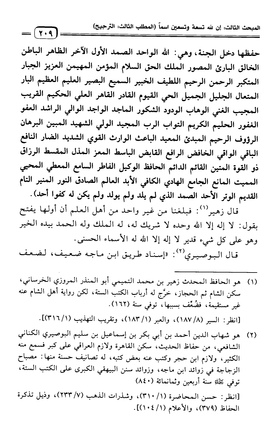 حفظها دخل الجنة، وهي: الله الواحد الصمد الأول الآخر الظاهر الباطن الخالق البارئ المصور الملك الحق السلام المؤمن المهيمن العزيز الجبار المتكبر الرحمن الرحيم اللطيف الخبير السميع البصير العليم العظيم البار المتعال الجليل الجميل الحي القيوم القادر القاهر العلي الحكيم القريب المجيب الغني الوهاب الودود الشكور الماجد الواجد الوالي الراشد العفو الغفور الحليم الكريم التواب الرب المجيد الولي الشهيد المبين البرهان الرؤوف الرحيم المبدئ المعيد الباعث الوارث القوي الشديد الضار النافع الباقي الواقي الخافض الرافع القابض الباسط المعز المذل المقسط الرزاق ذو القوة المتين القائم الدائم الحافظ الوكيل الفاطر السامع المعطي المحيي المميت المانع الجامع الهادي الكافي الأبد العالم الصادق النور المنير التام القديم الوتر الأحد الصمد الذي لم يلد ولم يولد ولم يكن له كفوا أحد).