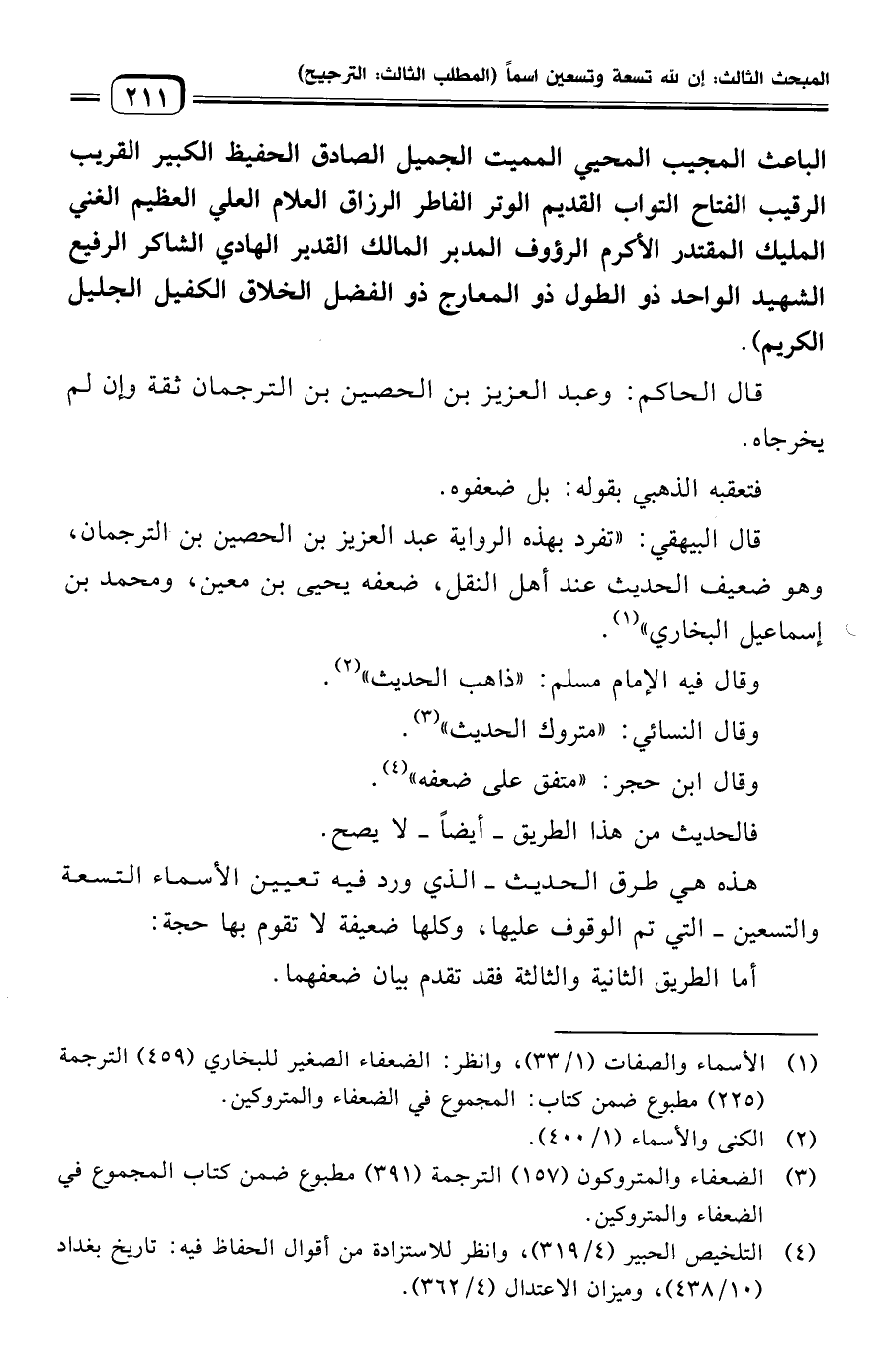 هذه هي طرق الحديث -الذي ورد فيه تعيين الأسماء التسعة والتسعين- التي تم الوقوف عليها، وكلها ضعيفة لا تقوم بها حجة: