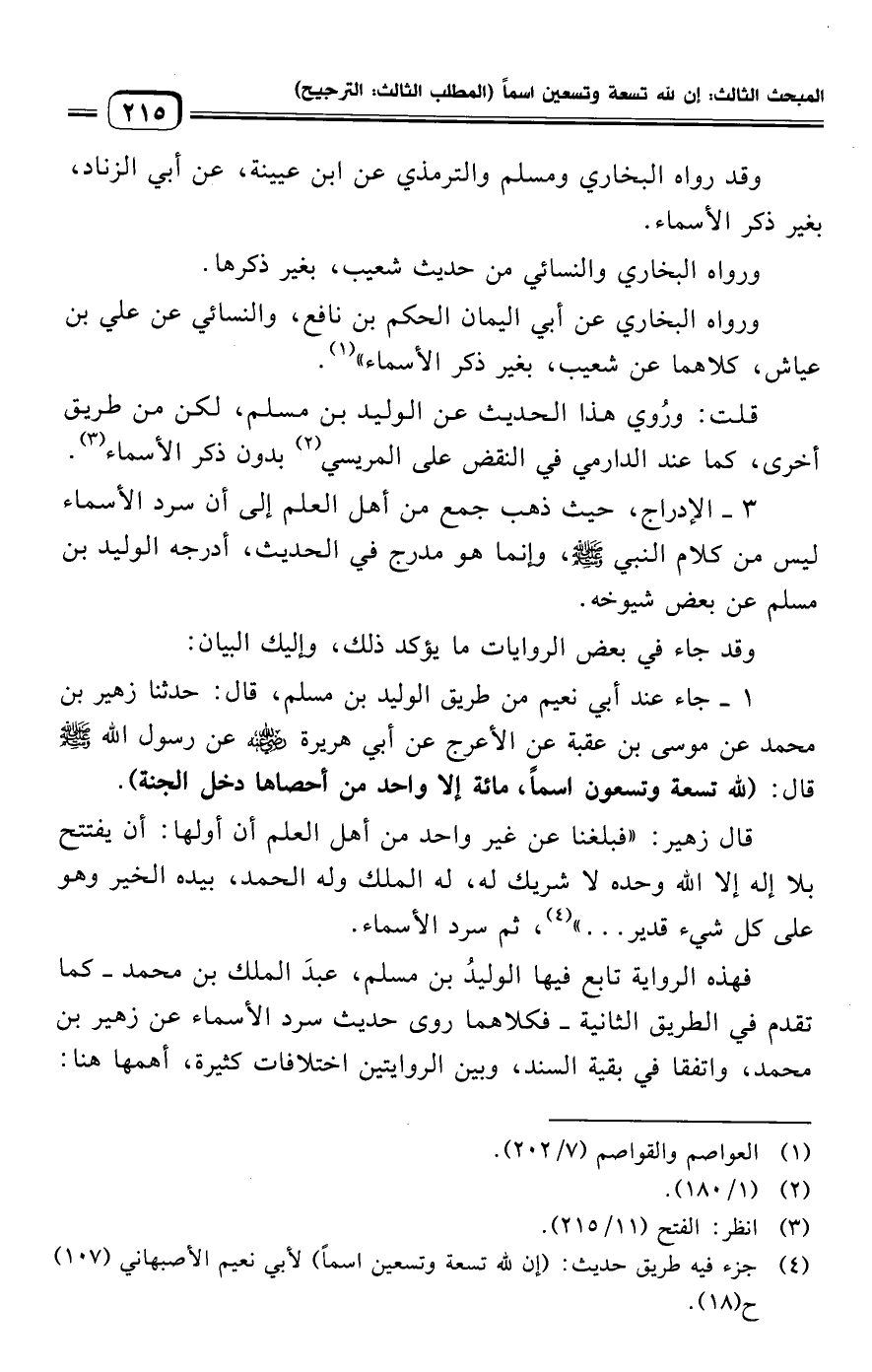 ١ - جاء عند أبي نعيم من طريق الوليد بن مسلم، قال: حدثنا زهير بن محمد عن موسى بن عقبة عن الأعرج عن أبي هريرة -رضي الله عنه- عن رسول الله -صلى الله عليه وسلم- قال: (لله تسعة وتسعون اسمًا، مائة إلا واحد من أحصاها دخل الجنة).