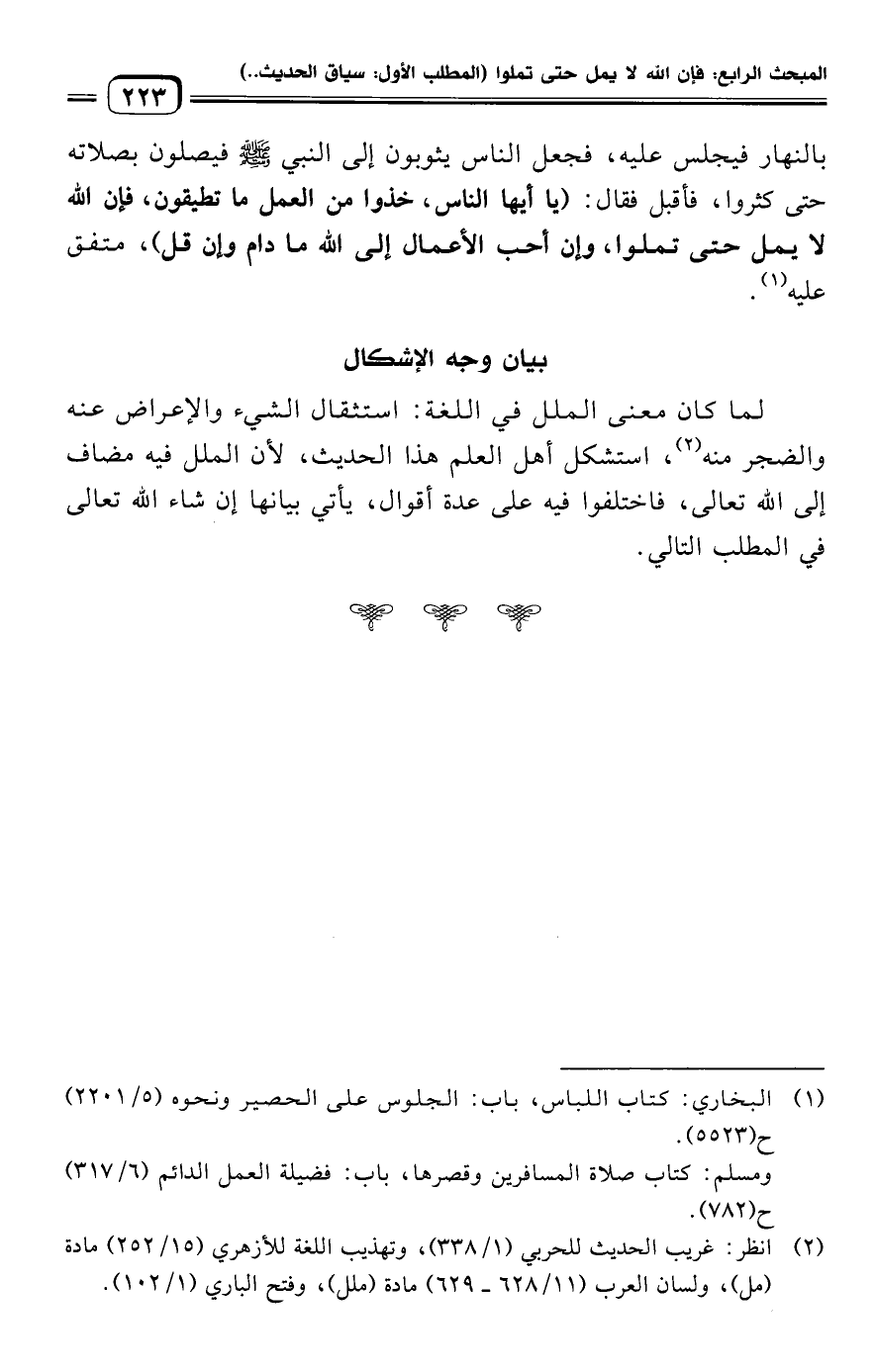 لما كان معنى الملل في اللغة: استثقال الشيء والإعراض عنه والضجر منه (¬٢)، استشكل أهل العلم هذا الحديث، لأن الملل فيه مضاف إلى الله تعالى، فاختلفوا فيه على عدة أقوال، يأتي بيانها إن شاء الله تعالى في المطلب التالي.