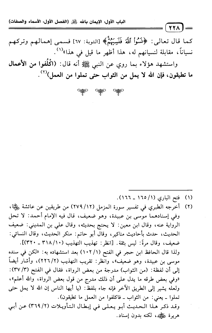 واستشهد هؤلاء بما روي عن النبي -صلى الله عليه وسلم- أنه قال: (اكْلُفوا من الأعمال ما تطيقون، فإن الله لا يمل من الثواب حتى تملوا من العمل) (¬٢).
