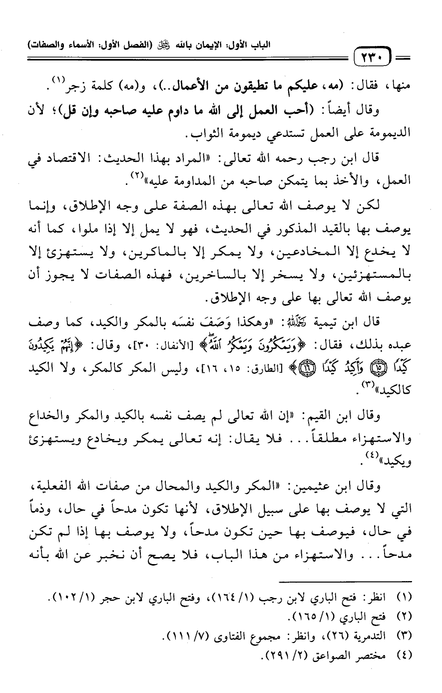 لكن لا يوصف الله تعالى بهذه الصفة على وجه الإطلاق، وإنما يوصف بها بالقيد المذكور في الحديث، فهو لا يمل إلا إذا ملوا، كما أنه لا يخدع إلا المخادعين، ولا يمكر إلا بالماكرين، ولا يستهزئ إلا بالمستهزئين، ولا يسخر إلا بالساخرين، فهذه الصفات لا يجوز أن يوصف الله تعالى بها على وجه الإطلاق.