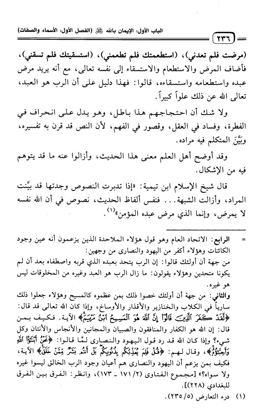 قال شيخ الإسلام ابن تيمية: "إذا تدبرت النصوص وجدتها قد بيَّنت المراد، وأزالت الشبهة ... فنفس ألفاظ الحديث، نصوص في أن الله نفسه لا يمرض، وإنما الذي مرض عبده المؤمن" (¬١).