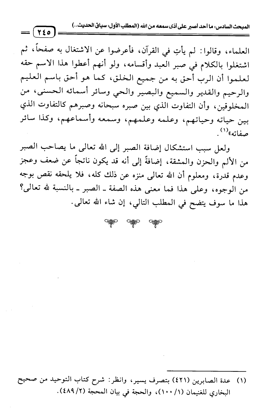 (¬١) عدة الصابرين (٤٢١) بتصرف يسير، وانظر: شرح كتاب التوحيد من صحيح البخاري للغنيمان (١/ ١٠٠)، والحجة في بيان المحجة (٢/ ٤٨٩).