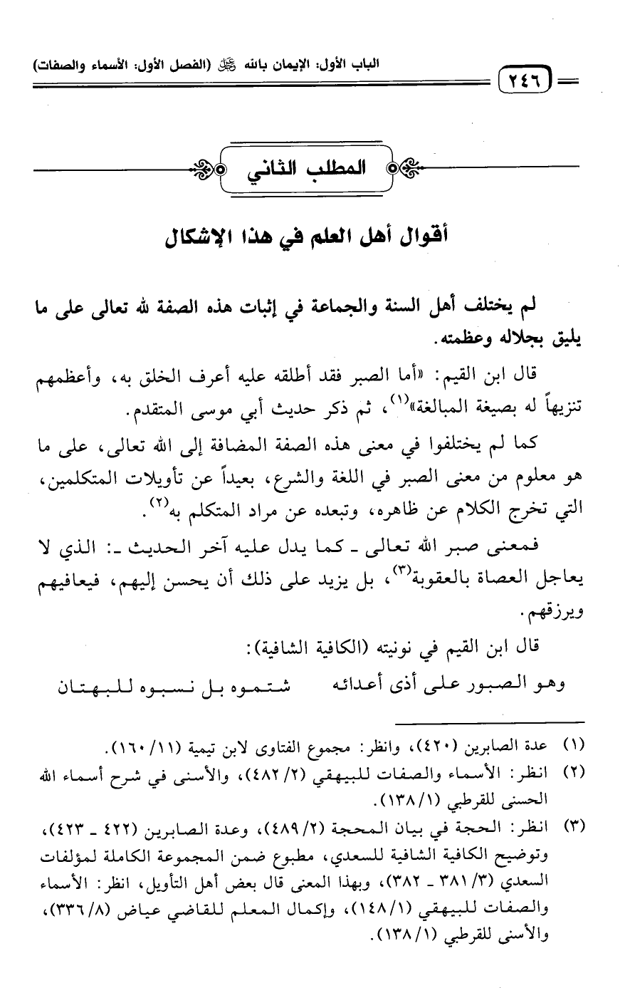 (¬٣) انظر: الحجة في بيان المحجة (٢/ ٤٨٩)، وعدة الصابرين (٤٢٢ - ٤٢٣)، وتوضيح الكافية الشافية للسعدي، مطبوع ضمن المجموعة الكاملة لمؤلفات السعدي (٣/ ٣٨١ - ٣٨٢)، وبهذا المعنى قال بعض أهل التأويل، انظر: الأسماء والصفات للبيهقي (١/ ١٤٨)، وإكمال المعلم للقاضي عياض (٨/ ٣٣٦)، والأسنى للقرطبي (١/ ١٣٨).