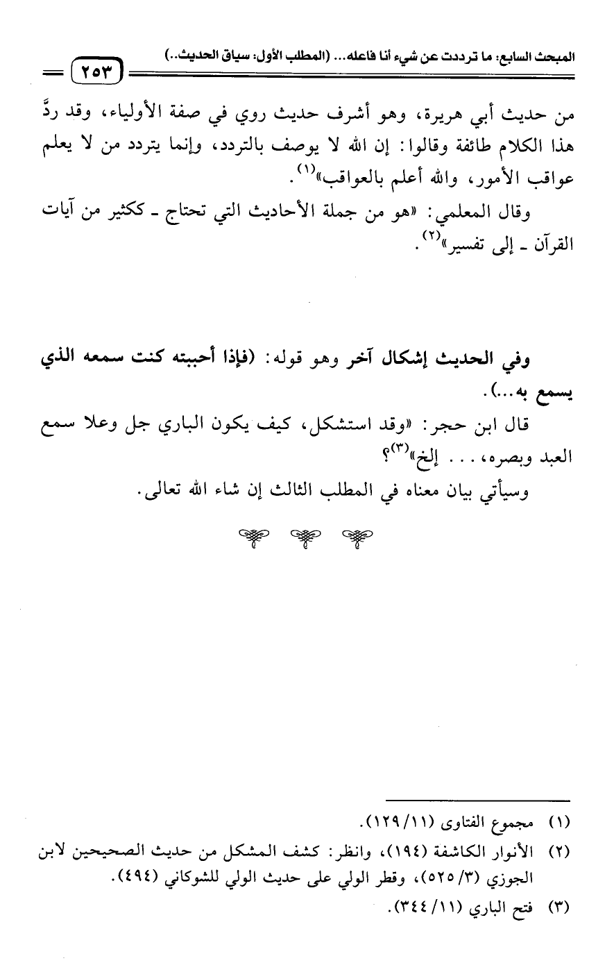 وقال المعلمي: "هو من جملة الأحاديث التي تحتاج -ككثير من آيات القرآن- إلى تفسير" (¬٢). وفي الحديث إشكال آخر وهو قوله: (فإذا أحببته كنت سمعه الذي يسمع به ... ).