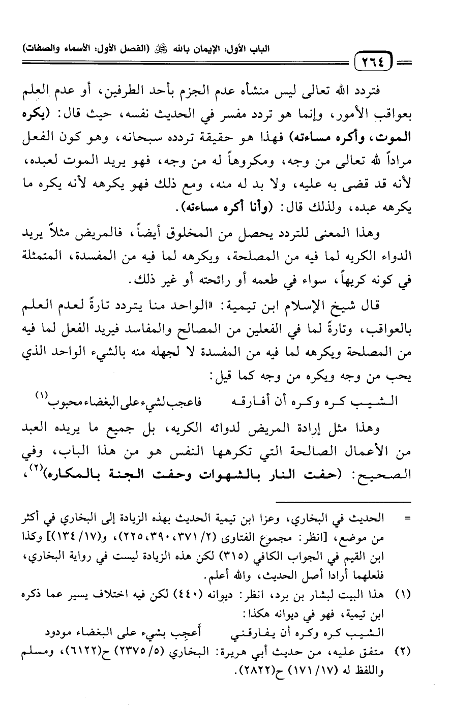 وهذا المعنى للتردد يحصل من المخلوق أيضًا، فالمريض مثلًا يريد الدواء الكريه لما فيه من المصلحة، ويكرهه لما فيه من المفسدة، المتمثلة في كونه كريهًا، سواء في طعمه أو رائحته أو غير ذلك.