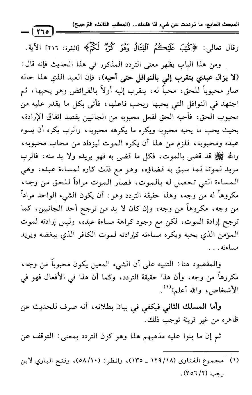وقال تعالى: {كُتِبَ عَلَيْكُمُ الْقِتَالُ وَهُوَ كُرْهٌ لَكُمْ} [البقرة: ٢١٦] الآية. ومن هذا الباب يظهر معنى التردد المذكور في هذا الحديث فإنه قال: (لا يزال عبدي يتقرب إلي بالنوافل حتى أحبه)، فإن العبد الذي هذا حاله صار محبوبًا للحق، محبًا له، يتقرب إليه أولًا بالفرائض وهو يحبها، ثم اجتهد في النوافل التي يحبها ويحب فاعلها، فأتى بكل ما يقدر عليه من محبوب الحق، فأحبه الحق لفعل محبوبه من الجانبين بقصد اتفاق الإرادة، بحيث يحب ما يحبه محبوبه ويكره ما يكرهه محبوبه، والرب يكره أن يسوء عبده ومحبوبه، فلزم من هذا أن يكره الموت ليزداد من محاب محبوبه، والله سبحانه وتعالى قد قضى بالموت، فكل ما قضى به فهو يريده ولا بد منه، فالرب مريد لموته لما سبق به قضاؤه، وهو مع ذلك كاره لمساءة عبده، وهي المساءة التي تحصل له بالموت، فصار الموت مرادًا للحق من وجه، مكروهًا له من وجه، وهذا حقيقة التردد وهو: أن يكون الشيء الواحد مرادًا من وجه، مكروهًا من وجه، وإن كان لا بد من ترجح أحد الجانبين، كما ترجح إرادة الموت، لكن مع وجود كراهة مساءة عبده، وليس إرادته لموت المؤمن الذي يحبه ويكره مساءته كإرادته لموت الكافر الذي يبغضه ويريد مساءته ...