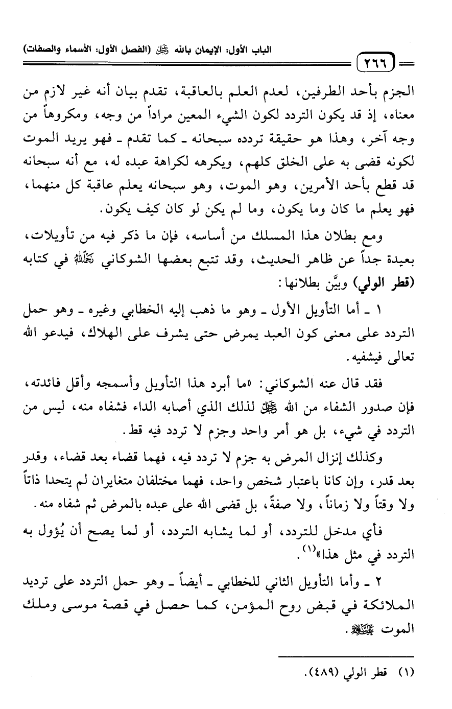 الجزم بأحد الطرفين، لعدم العلم بالعاقبة، تقدم بيان أنه غير لازم من معناه، إذ قد يكون التردد لكون الشيء المعين مرادًا من وجه، ومكروهًا من وجه آخر، وهذا هو حقيقة تردده سبحانه -كما تقدم- فهو يريد الموت لكونه قضى به على الخلق كلهم، ويكرهه لكراهة عبده له، مع أنه سبحانه قد قطع بأحد الأمرين، وهو الموت، وهو سبحانه يعلم عاقبة كل منهما، فهو يعلم ما كان وما يكون، وما لم يكن لو كان كيف يكون.