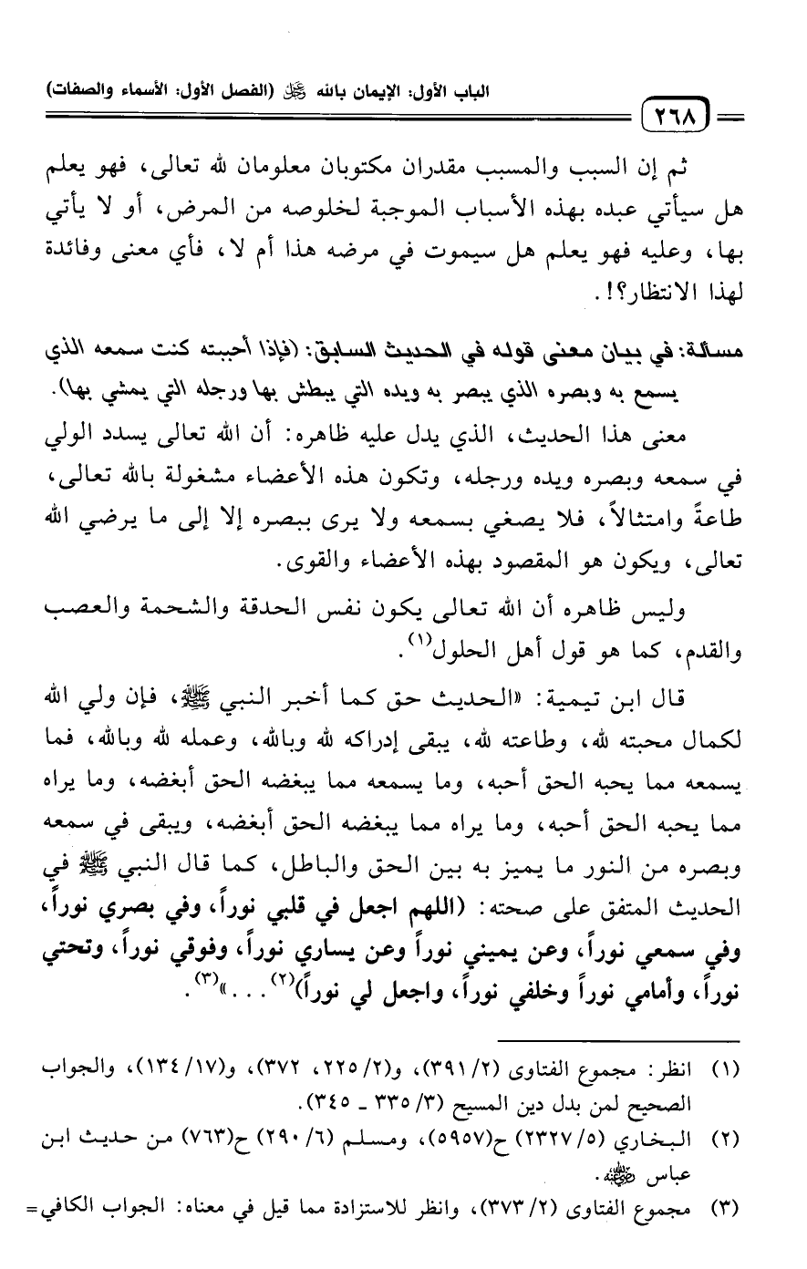 قال ابن تيمية: "الحديث حق كما أخبر النبي -صلى الله عليه وسلم-، فإن ولي الله لكمال محبته لله، وطاعته لله، يبقى إدراكه لله وبالله، وعمله لله وبالله، فما يسمعه مما يحبه الحق أحبه، وما يسمعه مما يبغضه الحق أبغضه، وما يراه مما يحبه الحق أحبه، وما يراه مما يبغضه الحق أبغضه، ويبقى في سمعه وبصره من النور ما يميز به بين الحق والباطل، كما قال النبي -صلى الله عليه وسلم- في الحديث المتفق على صحته: (اللهم اجعل في قلبي نورًا، وفي بصري نورًا، وفي سمعي نورًا، وعن يميني نورًا وعن يساري نورًا، وفوقي نورًا، وتحتي نورًا، وأمامي نورًا وخلفي نورًا، واجعل لي نورًا) (¬٢) ... " (¬٣).