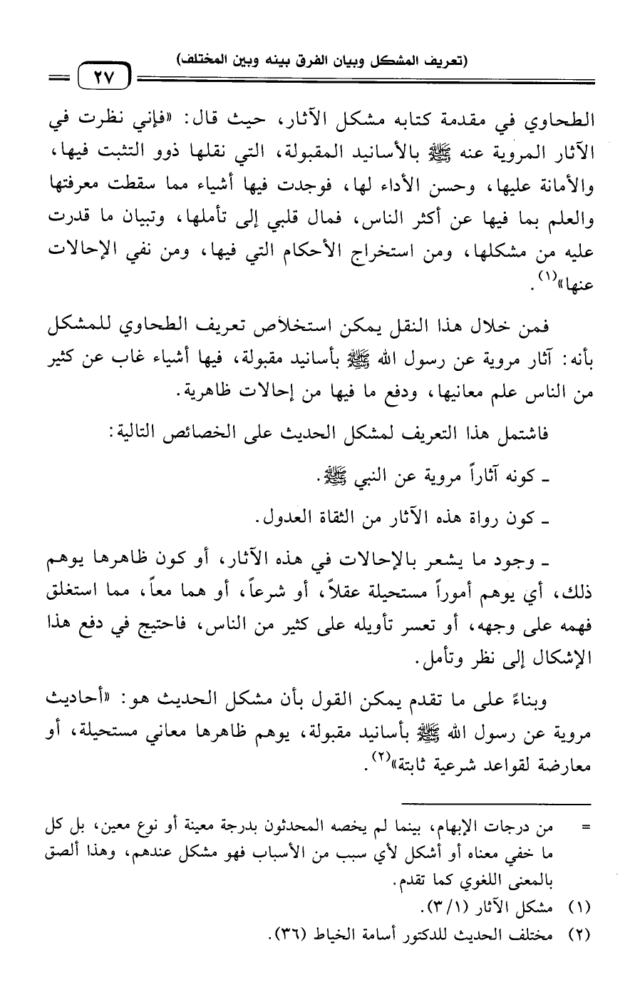 الطحاوي في مقدمة كتابه مشكل الآثار، حيث قال: "فإني نظرت في الآثار المروية عنه -صلى الله عليه وسلم- بالأسانيد المقبولة، التي نقلها ذوو التثبت فيها، والأمانة عليها، وحسن الأداء لها، فوجدت فيها أشياء مما سقطت معرفتها والعلم بما فيها عن أكثر الناس، فمال قلبي إلى تأملها، وتبيان ما قدرت عليه من مشكلها، ومن استخراج الأحكام التي فيها، ومن نفي الإحالات عنها" (¬١).