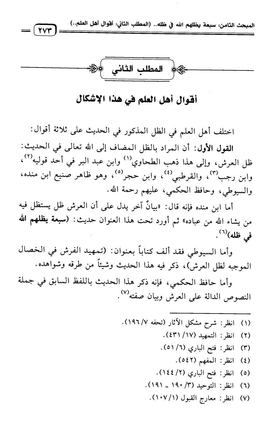 القول الأول: أن المراد بالظل المضاف إلى الله تعالى في الحديث: ظل العرش، وإلى هذا ذهب الطحاوي (¬١) وابن عبد البر في أحد قوليه (¬٢)، وابن رجب (¬٣)، والقرطبي (¬٤)، وابن حجر (¬٥)، وهو ظاهر صنيع ابن منده، والسيوطي، وحافظ الحكمي، عليهم رحمة الله.