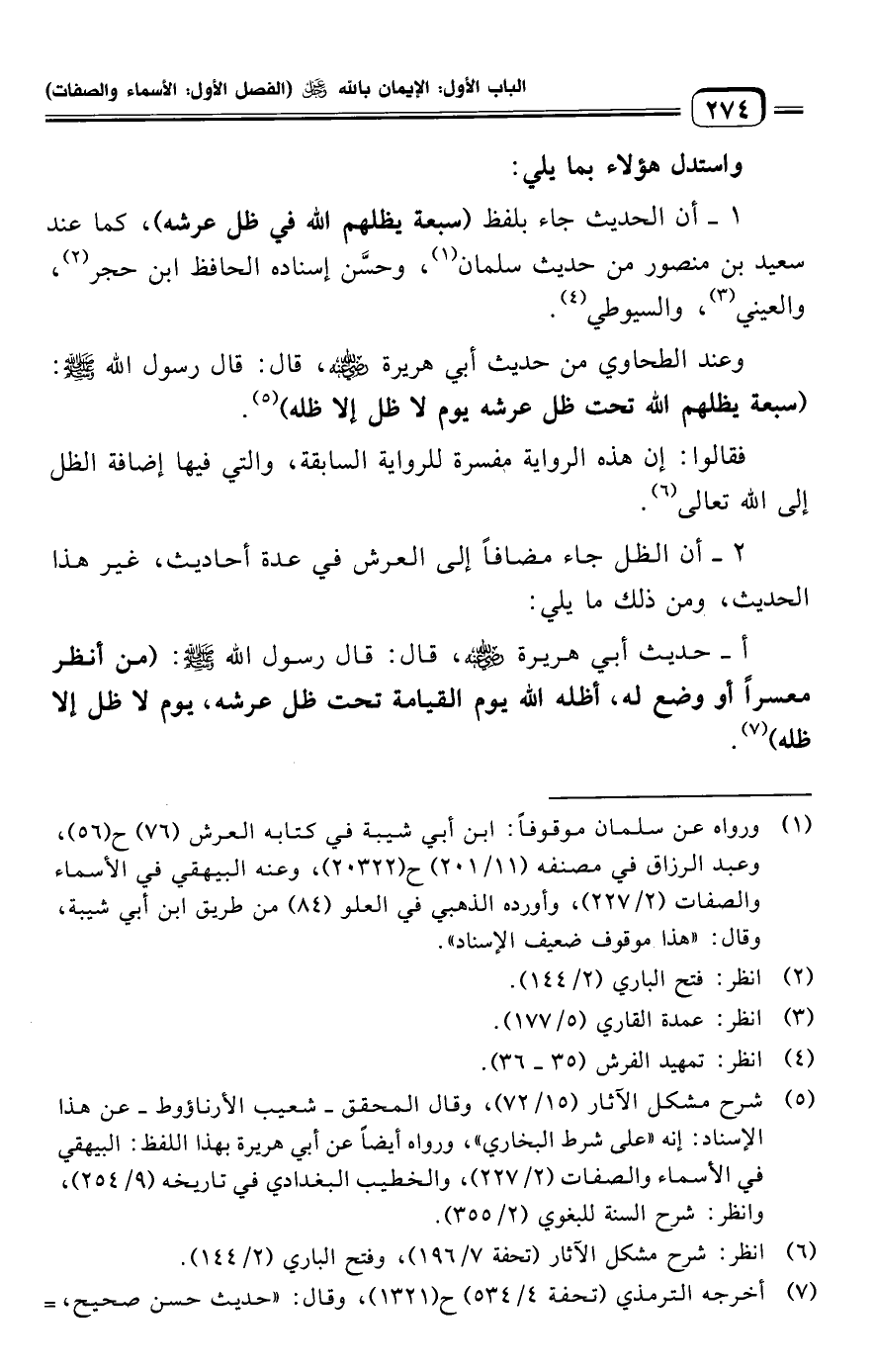 وعند الطحاوي من حديث أبي هريرة -رضي الله عنه-، قال: قال رسول الله -صلى الله عليه وسلم-: (سبعة يظلهم الله تحت ظل عرشه يوم لا ظل إلا ظله) (¬٥).