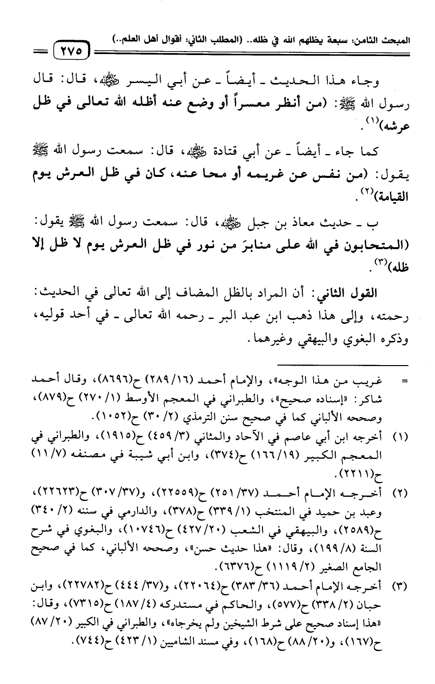 ب- حديث معاذ بن جبل -رضي الله عنه-، قال: سمعت رسول الله -صلى الله عليه وسلم- يقول: (المتحابون في الله على منابرَ من نور في ظل العرش يوم لا ظل إلا ظله) (¬٣).