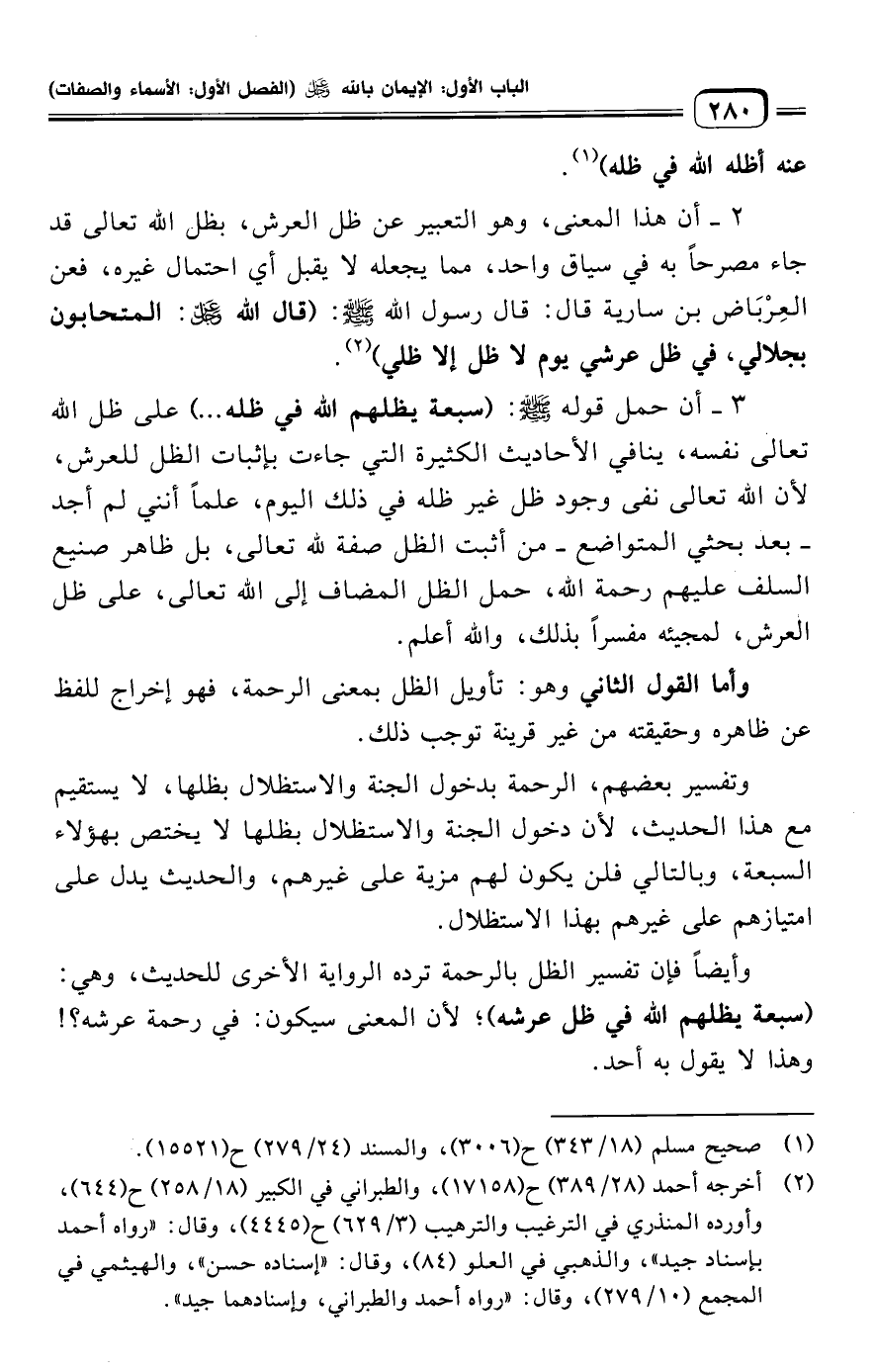 وأيضًا فإن تفسير الظل بالرحمة ترده الرواية الأخرى للحديث، وهي: (سبعة يظلهم الله في ظل عرشه)؛ لأن المعنى سيكون: في رحمة عرشه؟ ! وهذا لا يقول به أحد.