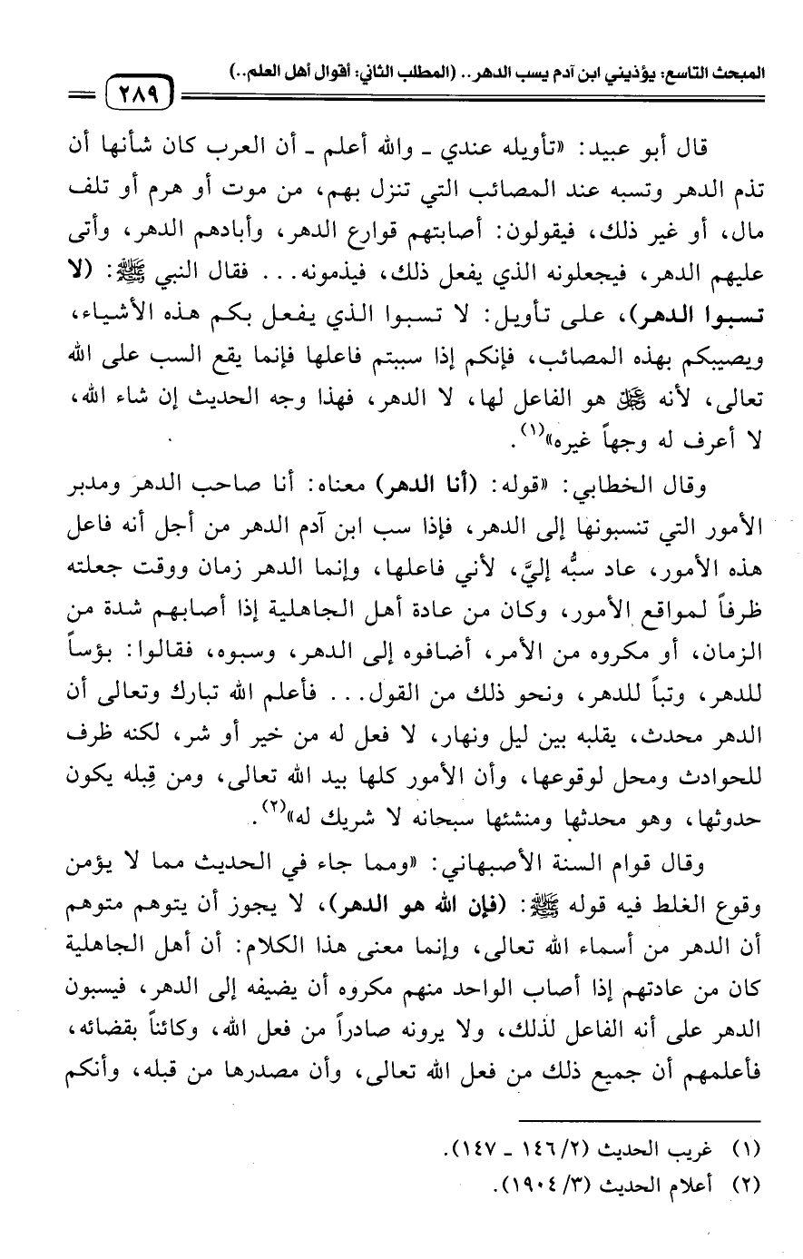 وقال الخطابي: "قوله: (أنا الدهر) معناه: أنا صاحب الدهر ومدبر الأمور التي تنسبونها إلى الدهر، فإذا سب ابن آدم الدهر من أجل أنه فاعل هذه الأمور، عاد سبُّه إليَّ، لأني فاعلها، وإنما الدهر زمان ووقت جعلته ظرفًا لمواقع الأمور، وكان من عادة أهل الجاهلية إذا أصابهم شدة من الزمان، أو مكروه من الأمر، أضافوه إلى الدهر، وسبوه، فقالوا: بؤسًا للدهر، وتبًا للدهر، ونحو ذلك من القول ... فأعلم الله تبارك وتعالى أن الدهر محدث، يقلبه بين ليل ونهار، لا فعل له من خير أو شر، لكنه ظرف للحوادث ومحل لوقوعها، وأن الأمور كلها بيد الله تعالى، ومن قِبله يكون حدوثها، وهو محدثها ومنشئها سبحانه لا شريك له" (¬٢).