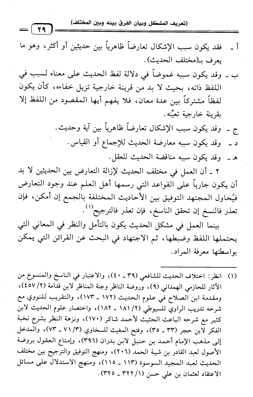 (¬١) انظر: اختلاف الحديث للشافعي (٣٩ - ٤٠)، والاعتبار في الناسخ والمنسوخ من الآثار للحازمي الهمداني (٩)، وروضة الناظر وجنة المناظر لابن قدامة (٢/ ٤٥٧)، ومقدمة ابن الصلاح في علوم الحديث (١٧٢ - ١٧٣)، والتقريب للنووي مع شرحه تدريب الراوي للسيوطي (٢/ ١٨١ - ١٨٢)، واختصار علوم الحديث لابن كثير مع شرحه الباعث الحثيث لأحمد شاكر (١٧٠)، ونزهة النظر بشرح نخبة الفكر لابن حجر (٣٣ - ٣٥)، وفتح المغيث للسخاوي (٣/ ٧١ - ٧٣)، والمدخل إلى مذهب الإمام أحمد بن حنبل لابن بدران (٣٩٦)، وإمتاع العقول بروضة الأصول لعبد القادر بن شيبة الحمد (٢٠٦)، ومنهج التوفيق والترجيح بين مختلف الحديث لعبد المجيد السوسوة (١١٣ - ١١٥)، ومنهج الاستدلال على مسائل الاعتقاد لعثمان بن علي حسن (١/ ٣٢٢ - ٣٢٥).