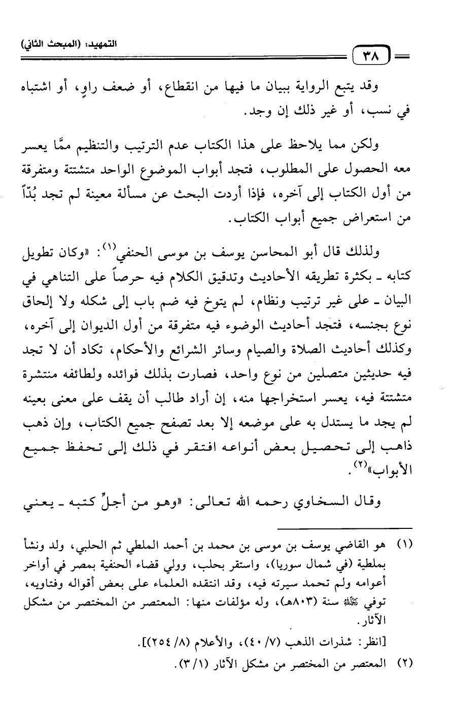 ولذلك قال أبو المحاسن يوسف بن موسى الحنفي (¬١): "وكان تطويل كتابه -بكثرة تطريقه الأحاديث وتدقيق الكلام فيه حرصًا على التناهي في البيان- على غير ترتيب ونظام، لم يتوخ فيه ضم باب إلى شكله ولا إلحاق نوع بجنسه، فتجد أحاديث الوضوء فيه متفرقة من أول الديوان إلى آخره، وكذلك أحاديث الصلاة والصيام وسائر الشرائع والأحكام، تكاد أن لا تجد فيه حديثين متصلين من نوع واحد، فصارت بذلك فوائده ولطائفه منتشرة متشتتة فيه، يعسر استخراجها منه، إن أراد طالب أن يقف على معنى بعينه لم يجد ما يستدل به على موضعه إلا بعد تصفح جميع الكتاب، وإن ذهب ذاهب إلى تحصيل بعض أنواعه افتقر في ذلك إلى تحفظ جميع الأبواب" (¬٢).