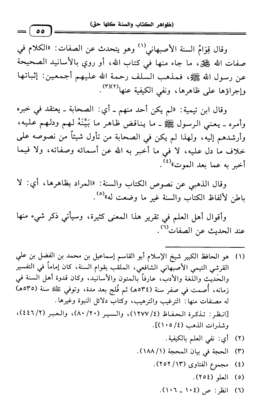 وقال قِوَامُ السنة الأصبهاني (¬١) وهو يتحدث عن الصفات: "الكلام في صفات الله عز وجل، ما جاء منها في كتاب الله، أو روي بالأسانيد الصحيحة عن رسول الله -صلى الله عليه وسلم-، فمذهب السلف رحمة الله عليهم أجمعين: إثباتها وإجراؤها على ظاهرها، ونفي الكيفية عنها (¬٢) (¬٣).