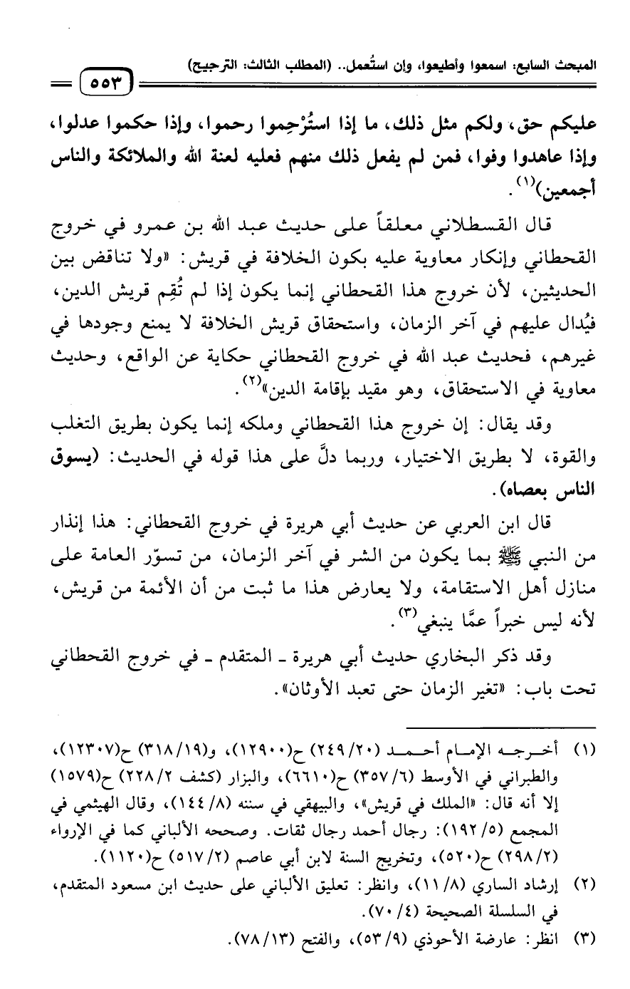 قال القسطلاني معلقًا على حديث عبد الله بن عمرو في خروج القحطاني وإنكار معاوية عليه بكون الخلافة في قريش: "ولا تناقض بين الحديثين، لأن خروج هذا القحطاني إنما يكون إذا لم تُقِم قريش الدين، فيُدال عليهم في آخر الزمان، واستحقاق قريش الخلافة لا يمنع وجودها في غيرهم، فحديث عبد الله في خروج القحطاني حكاية عن الواقع، وحديث معاوية في الاستحقاق، وهو مقيد بإقامة الدين" (¬٢).