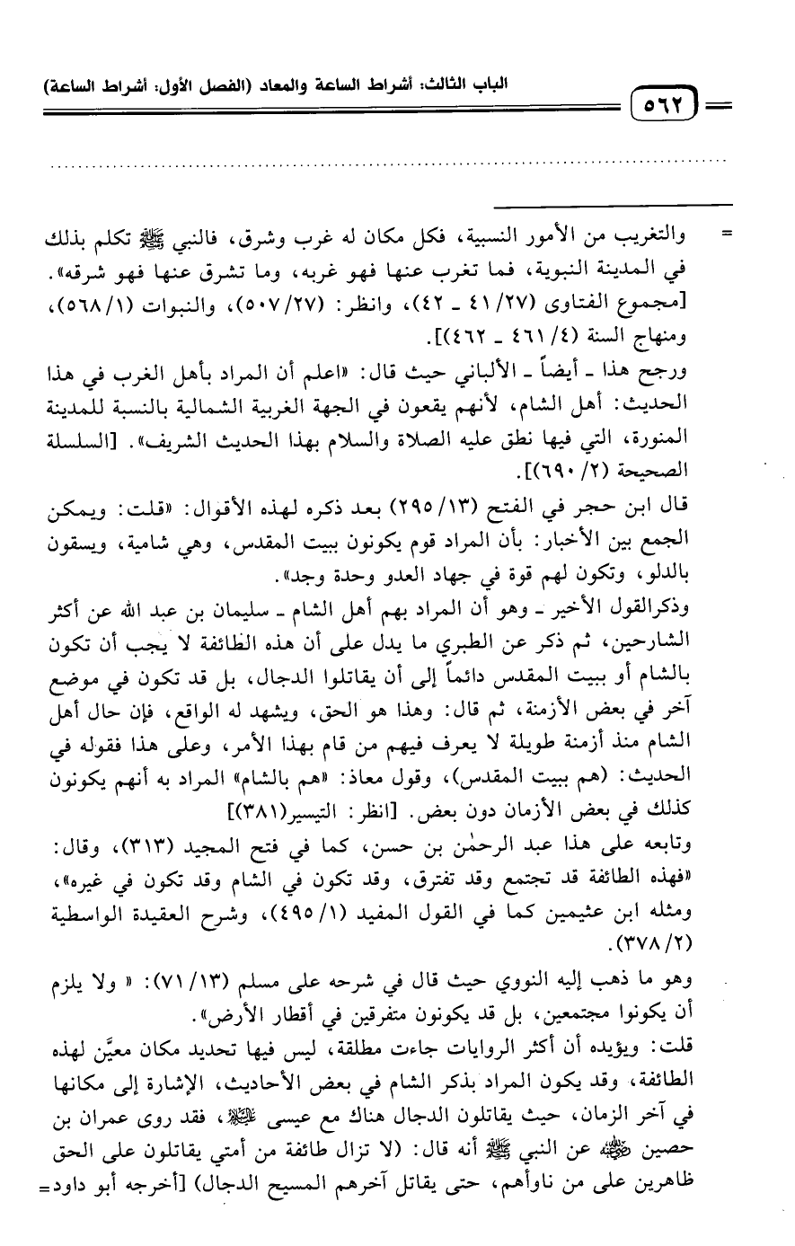قلت: ويؤيده أن أكثر الروايات جاءت مطلقة، ليس فيها تحديد مكان معيَّن لهذه الطائفة، وقد يكون المراد بذكر الشام في بعض الأحاديث، الإشارة إلى مكانها في آخر الزمان، حيث يقاتلون الدجال هناك مع عيسى عليه السلام، فقد روى عمران بن حصين -رضي الله عنه- عن النبي -صلى الله عليه وسلم- أنه قال: (لا تزال طائفة من أمتي يقاتلون على الحق ظاهرين على من ناوأهم، حتى يقاتل آخرهم المسيح الدجال) [أخرجه أبو داود =