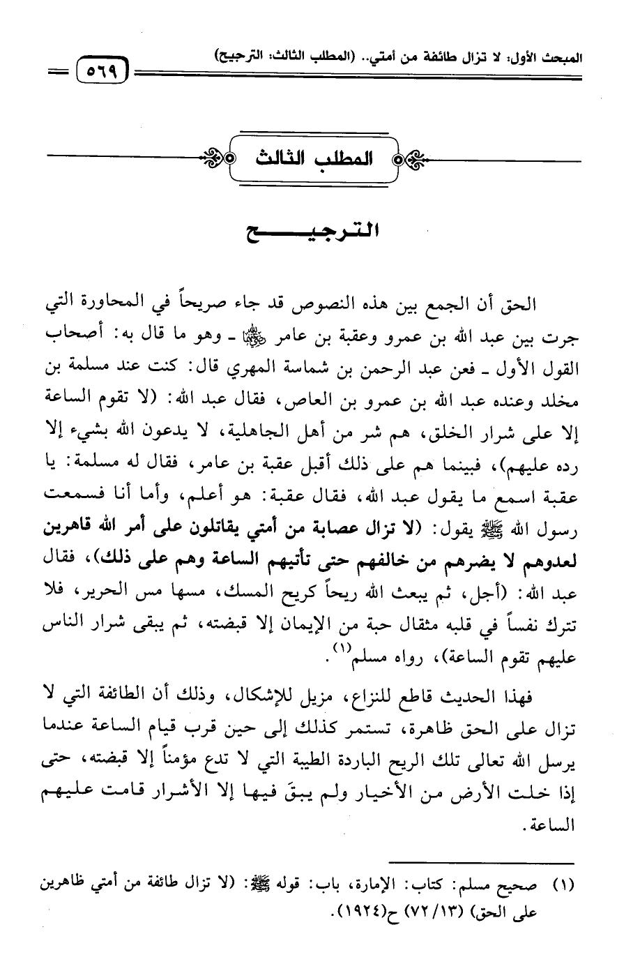 (¬١) صحيح مسلم: كتاب: الإمارة، باب: قوله -صلى الله عليه وسلم-: (لا تزال طائفة من أمتي ظاهرين على الحق) (١٣/ ٧٢) ح (١٩٢٤).
