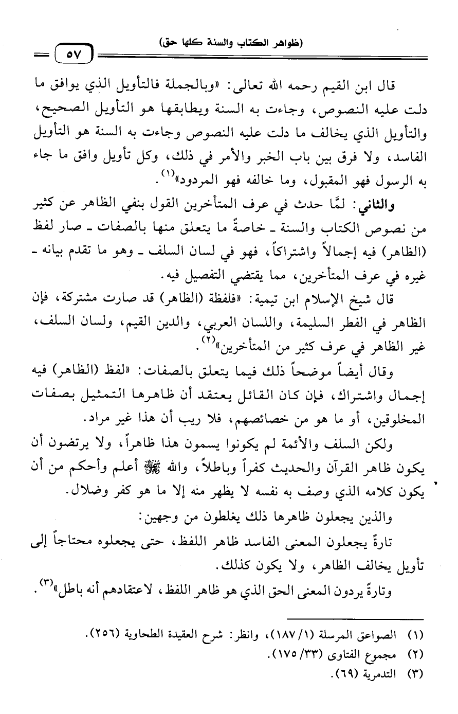 ولكن السلف والأئمة لم يكونوا يسمون هذا ظاهرًا، ولا يرتضون أن يكون ظاهر القرآن والحديث كفرًا وباطلًا، والله سبحانه وتعالى أعلم وأحكم من أن يكون كلامه الذي وصف به نفسه لا يظهر منه إلا ما هو كفر وضلال.