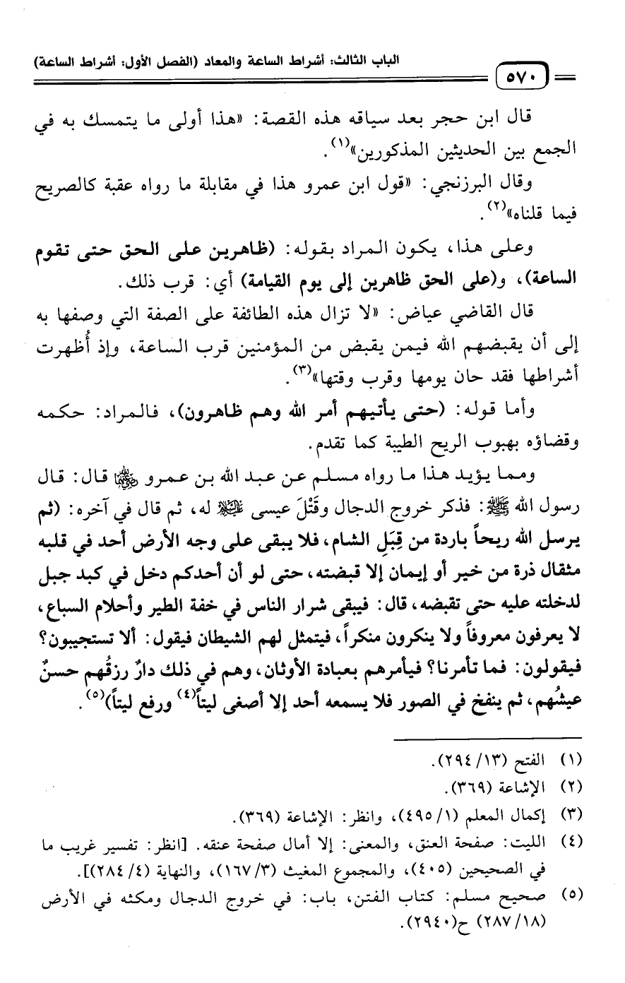 قال القاضي عياض: "لا تزال هذه الطائفة على الصفة التي وصفها به إلى أن يقبضهم الله فيمن يقبض من المؤمنين قرب الساعة، وإذ أُظهرت أشراطها فقد حان يومها وقرب وقتها" (¬٣).