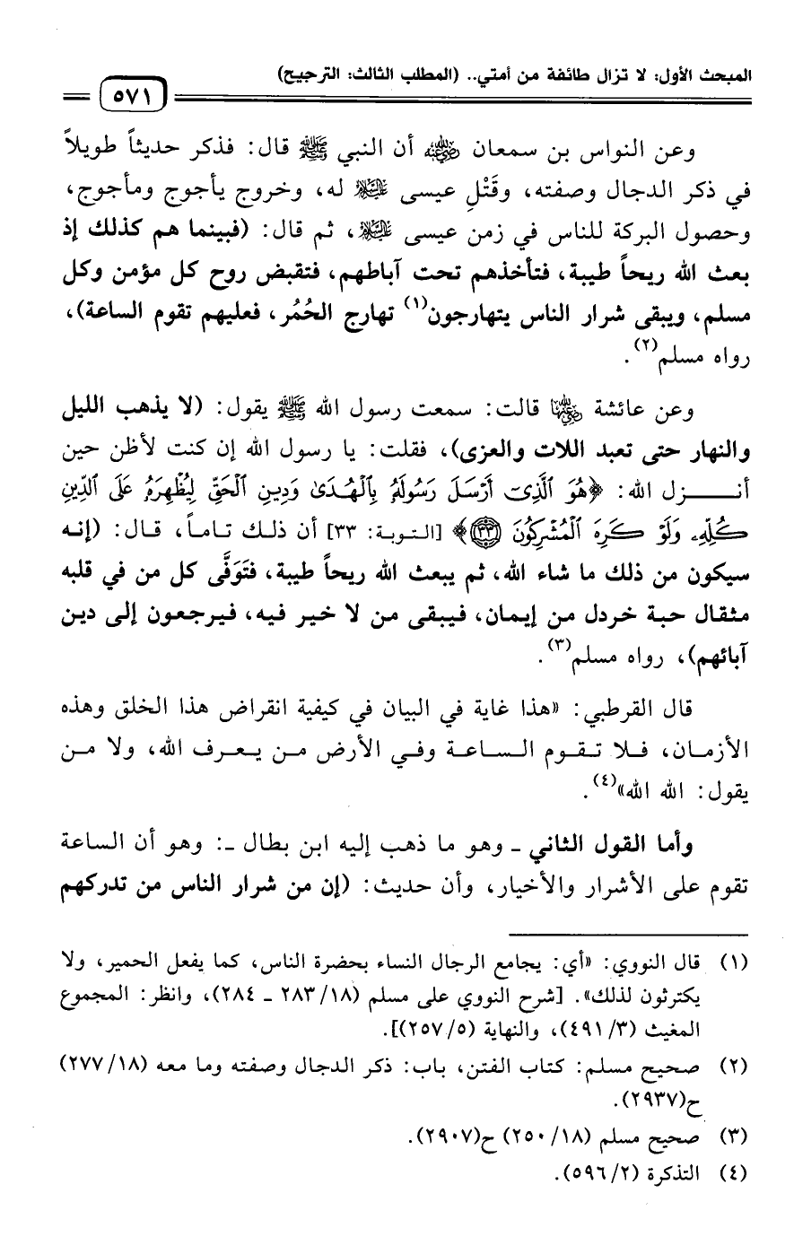 قال القرطبي: "هذا غاية في البيان في كيفية انقراض هذا الخلق وهذه الأزمان، فلا تقوم الساعة وفي الأرض من يعرف الله، ولا من يقول: الله الله" (¬٤).