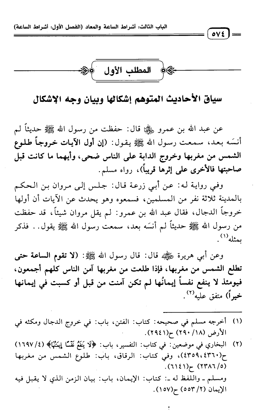 (¬٢) البخاري في موضعين: في كتاب: التفسير، باب: {لَا يَنْفَعُ نَفْسًا إِيمَانُهَا} (٤/ ١٦٩٧) ح (٤٣٦٠، ٤٣٥٩)، وفي كتاب: الرقاق، باب: طلوع الشمس من مغربها (٥/ ٢٣٨٦) ح (٦١٤١).