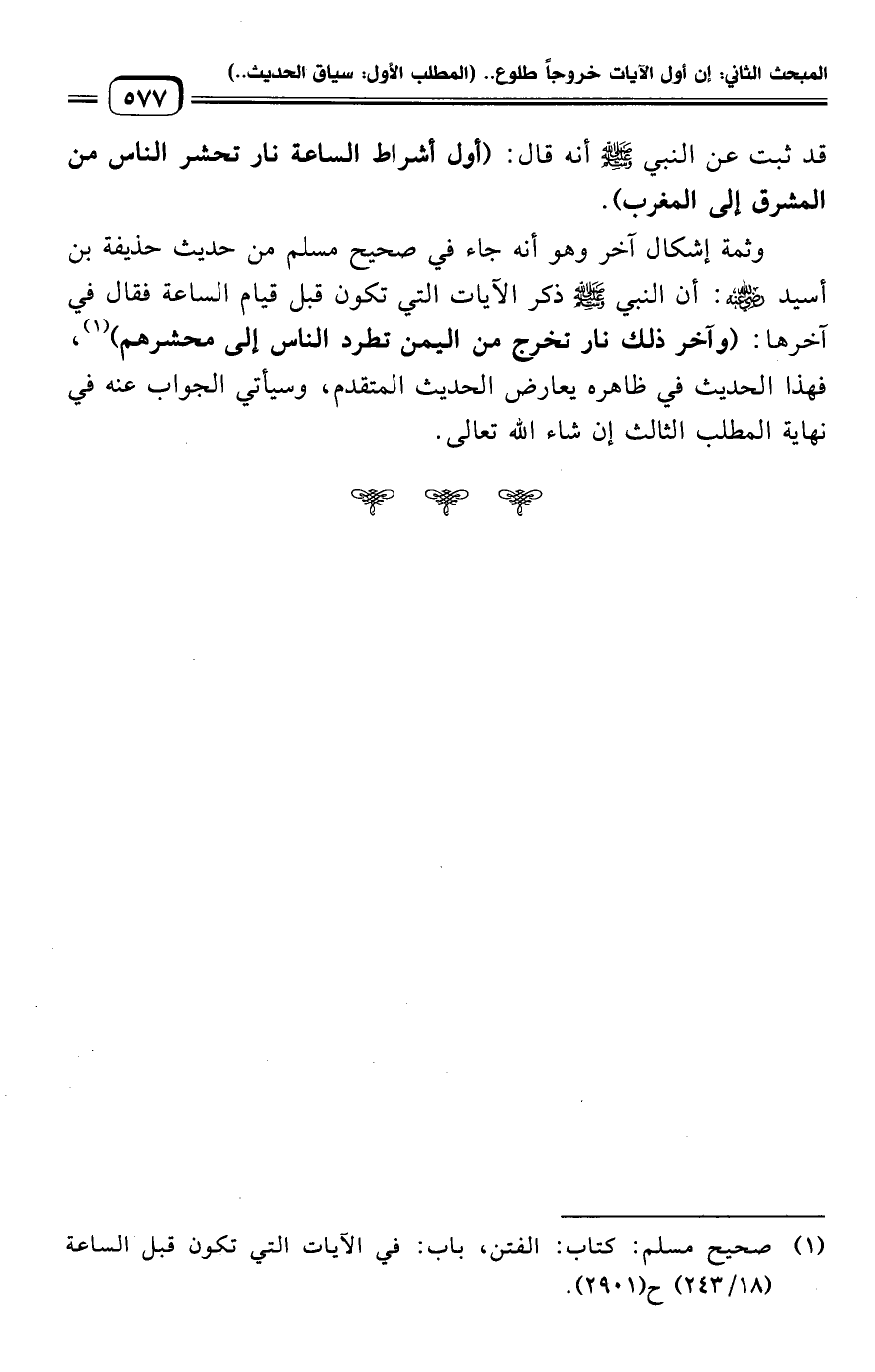 (¬١) صحيح مسلم: كتاب: الفتن، باب: في الآيات التي تكون قبل الساعة (١٨/ ٢٤٣) ح (٢٩٠١).