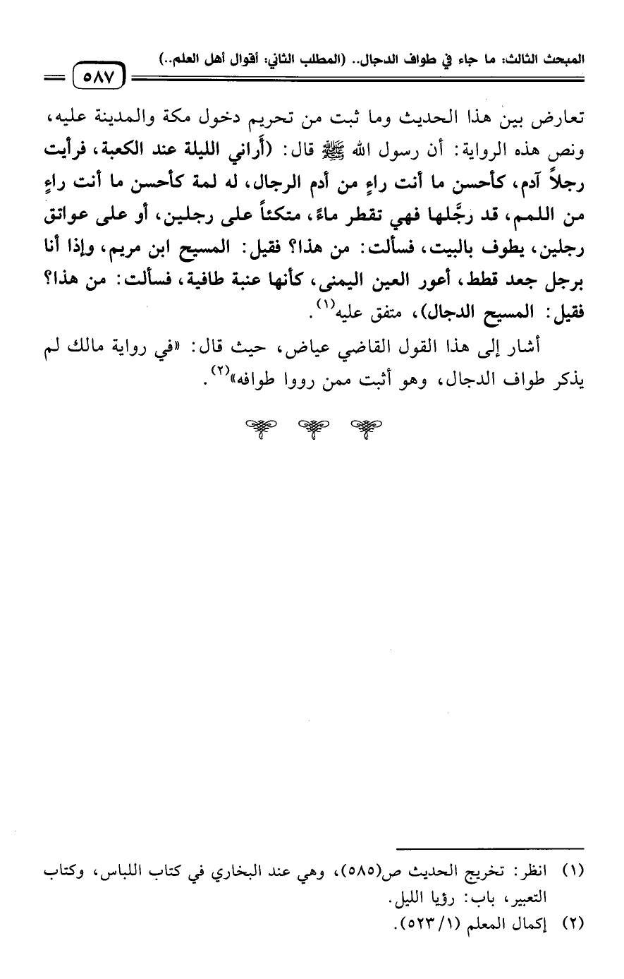 تعارض بين هذا الحديث وما ثبت من تحريم دخول مكة والمدينة عليه، ونص هذه الرواية: أن رسول الله -صلى الله عليه وسلم- قال: (أَراني الليلة عند الكعبة، فرأيت رجلًا آدم، كأحسن ما أنت راءٍ من أدم الرجال، له لمة كأحسن ما أنت راءٍ من اللمم، قد رجَّلها فهي تقطر ماءً، متكئًا على رجلين، أو على عواتق رجلين، يطوف بالبيت، فسألت: من هذا؟ فقيل: المسيح ابن مريم، وإذا أنا برجل جعد قطط، أعور العين اليمنى، كأنها عنبة طافية، فسألت: من هذا؟ فقيل: المسيح الدجال)، متفق عليه (¬١).