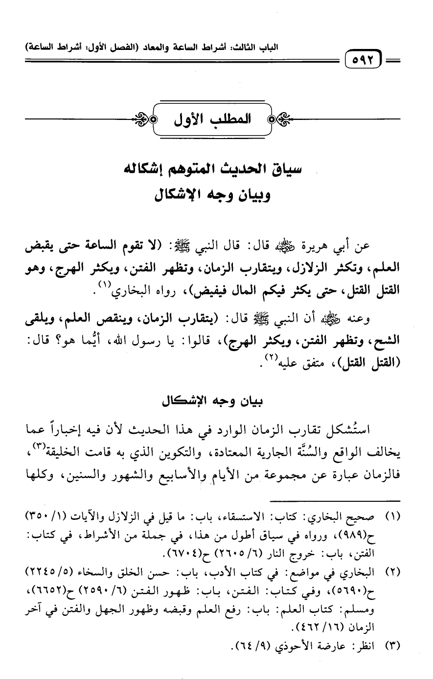 استُشكل تقارب الزمان الوارد في هذا الحديث لأن فيه إخبارًا عما يخالف الواقع والسُنَّة الجارية المعتادة، والتكوين الذي به قامت الخليقة (¬٣)، فالزمان عبارة عن مجموعة من الأيام والأسابيع والشهور والسنين، وكلها