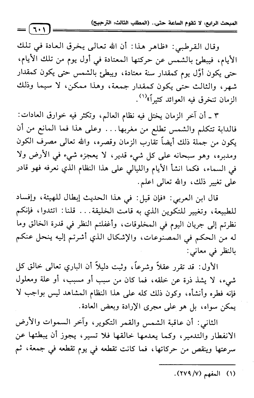 وقال القرطبي: "ظاهر هذا: أن الله تعالى يخرق العادة في تلك الأيام، فيبطئ بالشمس عن حركتها المعتادة في أول يوم من تلك الأيام، حتى يكون أوَّل يوم كمقدار سنة معتادة، ويبطئ بالشمس حتى يكون كمقدار شهر، والثالث حتى يكون كمقدار جمعة، وهذا ممكن، لا سيما وذلك الزمان تنخرق فيه العوائد كثيرًا" (¬١).