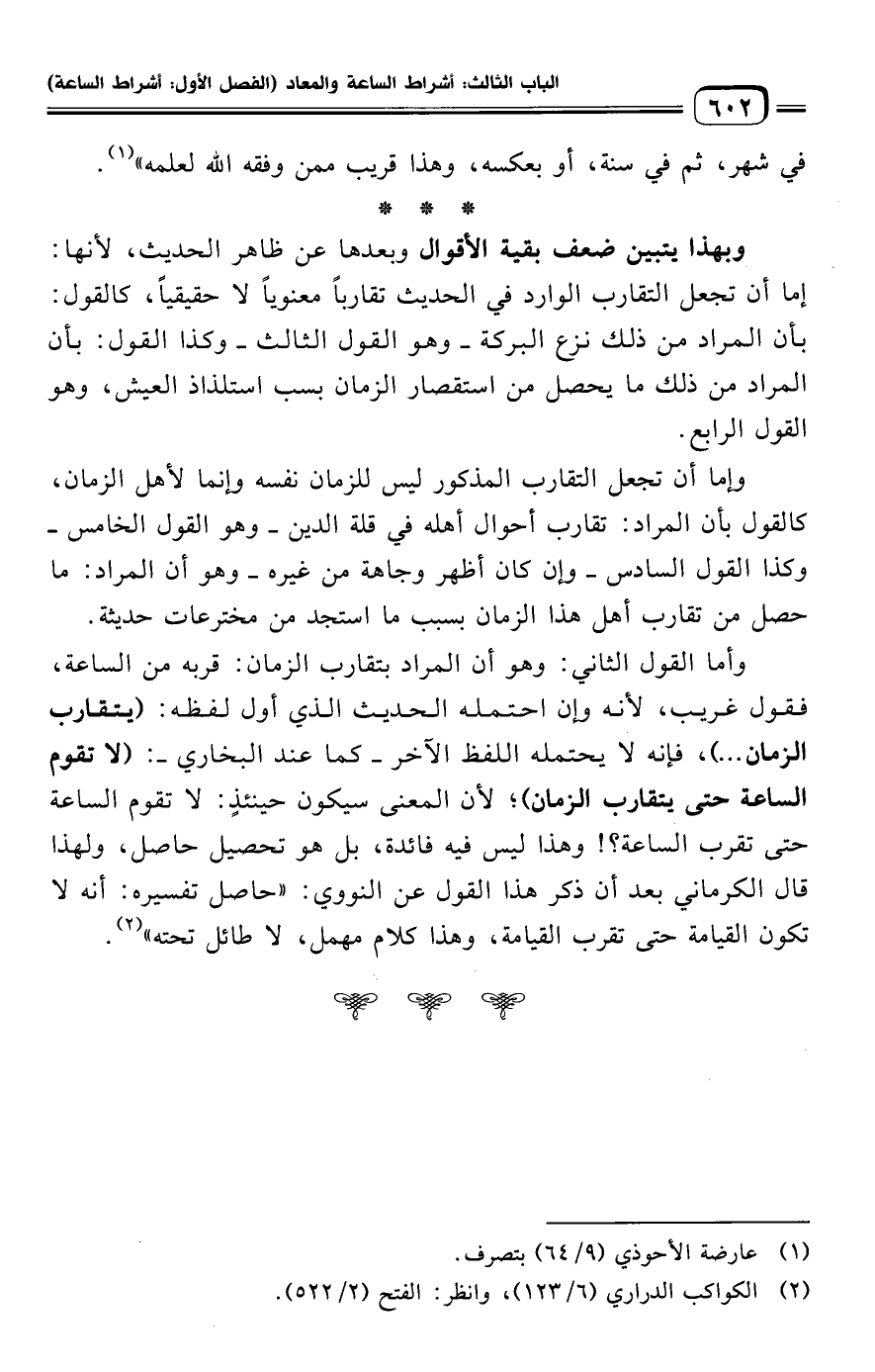 وأما القول الثاني: وهو أن المراد بتقارب الزمان: قربه من الساعة، فقول غريب، لأنه وإن احتمله الحديث الذي أول لفظه: (يتقارب الزمان ... )، فإنه لا يحتمله اللفظ الآخر -كما عند البخاري-: (لا تقوم الساعة حتى يتقارب الزمان)؛ لأن المعنى سيكون حينئذٍ: لا تقوم الساعة حتى تقرب الساعة؟ ! وهذا ليس فيه فائدة، بل هو تحصيل حاصل، ولهذا قال الكرماني بعد أن ذكر هذا القول عن النووي: "حاصل تفسيره: أنه لا تكون القيامة حتى تقرب القيامة، وهذا كلام مهمل، لا طائل تحته" (¬٢).