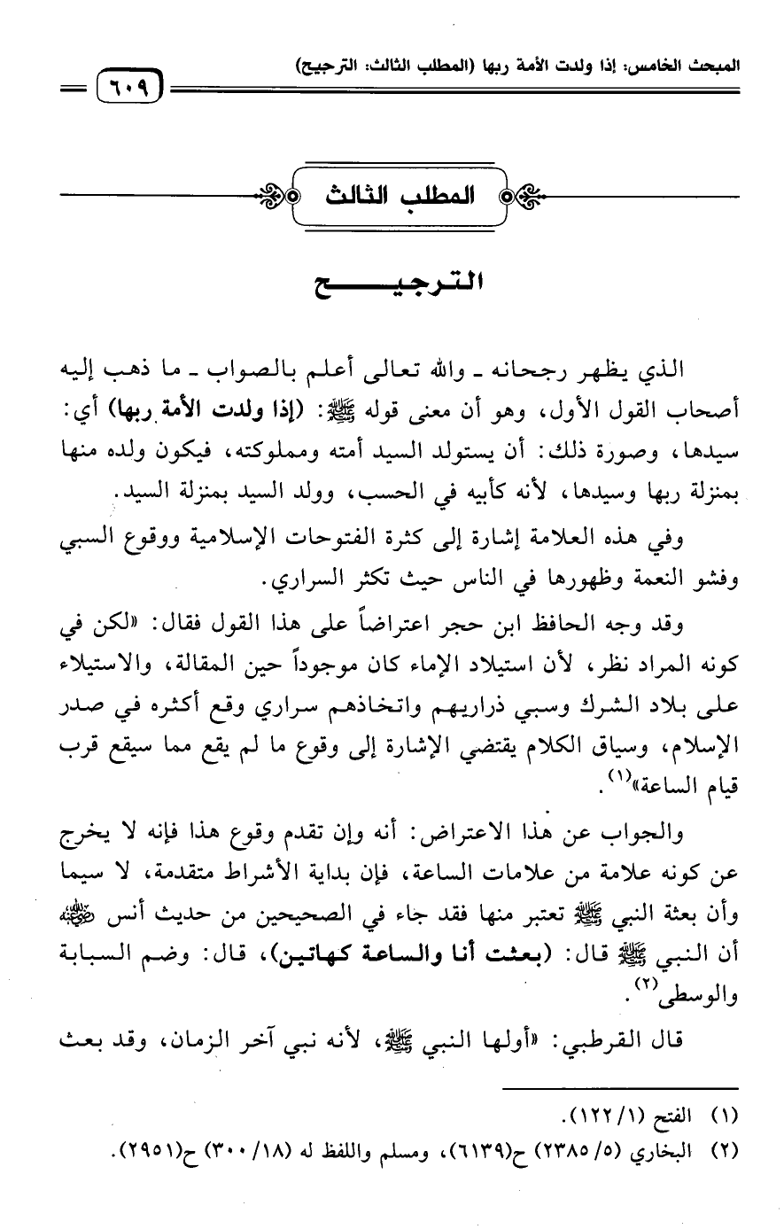 وقد وجه الحافظ ابن حجر اعتراضًا على هذا القول فقال: "لكن في كونه المراد نظر، لأن استيلاد الإماء كان موجودًا حين المقالة، والاستيلاء على بلاد الشرك وسبي ذراريهم واتخاذهم سراري وقع أكثره في صدر الإسلام، وسياق الكلام يقتضي الإشارة إلى وقوع ما لم يقع مما سيقع قرب قيام الساعة" (¬١).