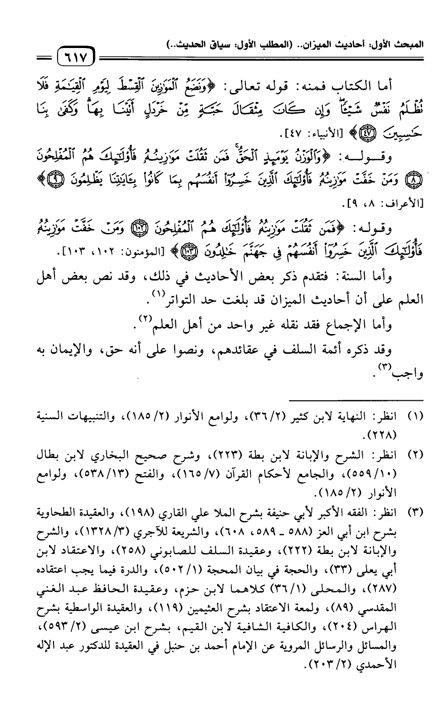 (¬٣) انظر: الفقه الأكبر لأبي حنيفة بشرح الملا علي القاري (١٩٨)، والعقيدة الطحاوية بشرح ابن أبي العز (٥٨٨ - ٥٨٩، ٦٠٨)، والشريعة للآجري (٣/ ١٣٢٨)، والشرح والإبانة لابن بطة (٢٢٢)، وعقيدة السلف للصابوني (٢٥٨)، والاعتقاد لابن أبي يعلى (٣٣)، والحجة في بيان المحجة (١/ ٥٠٢)، والدرة فيما يجب اعتقاده (٢٨٧)، والمحلى (١/ ٣٦) كلاهما لابن حزم، وعقيدة الحافظ عبد الغني المقدسي (٨٩)، ولمعة الاعتقاد بشرح العثيمين (١١٩)، والعقيدة الواسطية بشرح الهراس (٢٠٤)، والكافية الشافية لابن القيم، بشرح ابن عيسى (٢/ ٥٩٣)، والمسائل والرسائل المروية عن الإمام أحمد بن حنبل في العقيدة للدكتور عبد الإله الأحمدي (٢/ ٢٠٣).