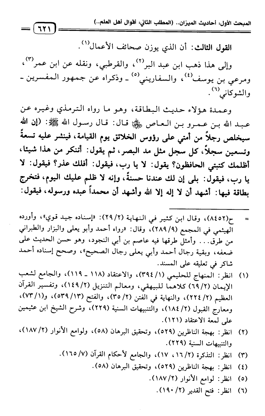 وعمدة هؤلاء حديث البطاقة، وهو ما رواه الترمذي وغيره عن عبد الله بن عمرو بن العاص -رضي الله عنهما- قال: قال رسول الله -صلى الله عليه وسلم-: (إن الله سيخلص رجلًا من أمتي على رؤوس الخلائق يوم القيامة، فينشر عليه تسعةً وتسعين سجلًا، كل سجل مثل مد البصر، ثم يقول: أتنكر من هذا شيئا، أظلمك كتبتي الحافظون؟ يقول: لا يا رب، فيقول: أفلك عذر؟ فيقول: لا يا رب، فيقول: بلى إن لك عندنا حسنةً، وإنه لا ظلم عليك اليوم، فتخرج بطاقة فيها: أشهد أن لا إله إلا الله وأشهد أن محمدًا عبده ورسوله، فيقول: