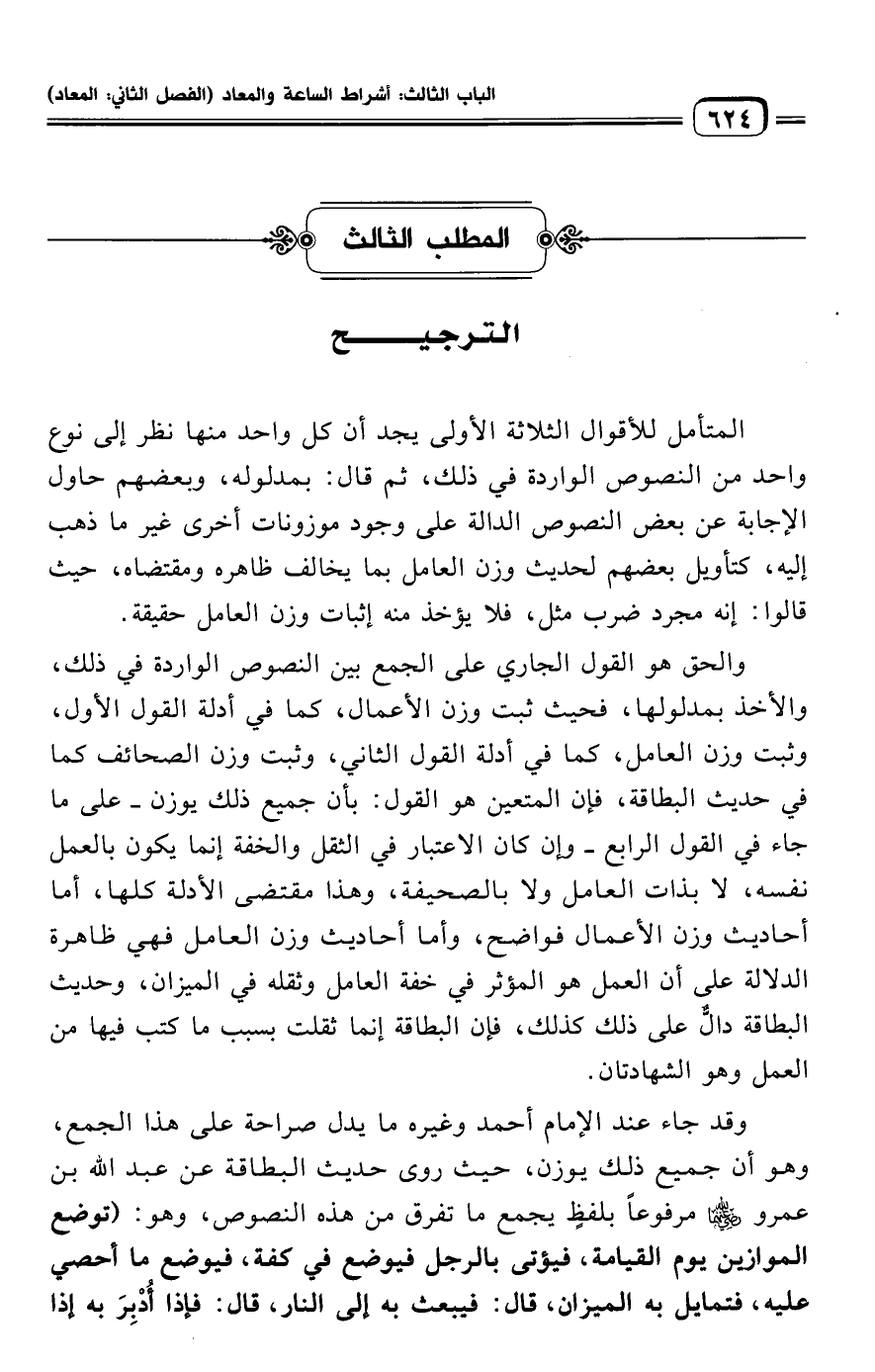 وقد جاء عند الإمام أحمد وغيره ما يدل صراحة على هذا الجمع، وهو أن جميع ذلك يوزن، حيث روى حديث البطاقة عن عبد الله بن عمرو -رضي الله عنهما- مرفوعًا بلفظٍ يجمع ما تفرق من هذه النصوص، وهو: (توضع الموازين يوم القيامة، فيؤتى بالرجل فيوضع في كفة، فيوضع ما أحصي عليه، فتمايل به الميزان، قال: فيبعث به إلى النار، قال: فإذا أُدْبِرَ به إذا