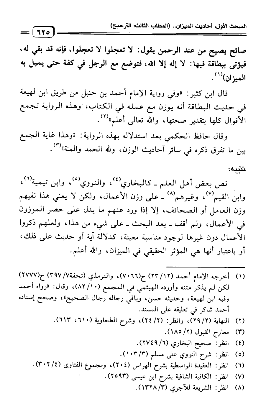 وقال حافظ الحكمي بعد استدلاله بهذه الرواية: "وهذا غاية الجمع بين ما تفرق ذكره في سائر أحاديث الوزن، ولله الحمد والمنة" (¬٣).
