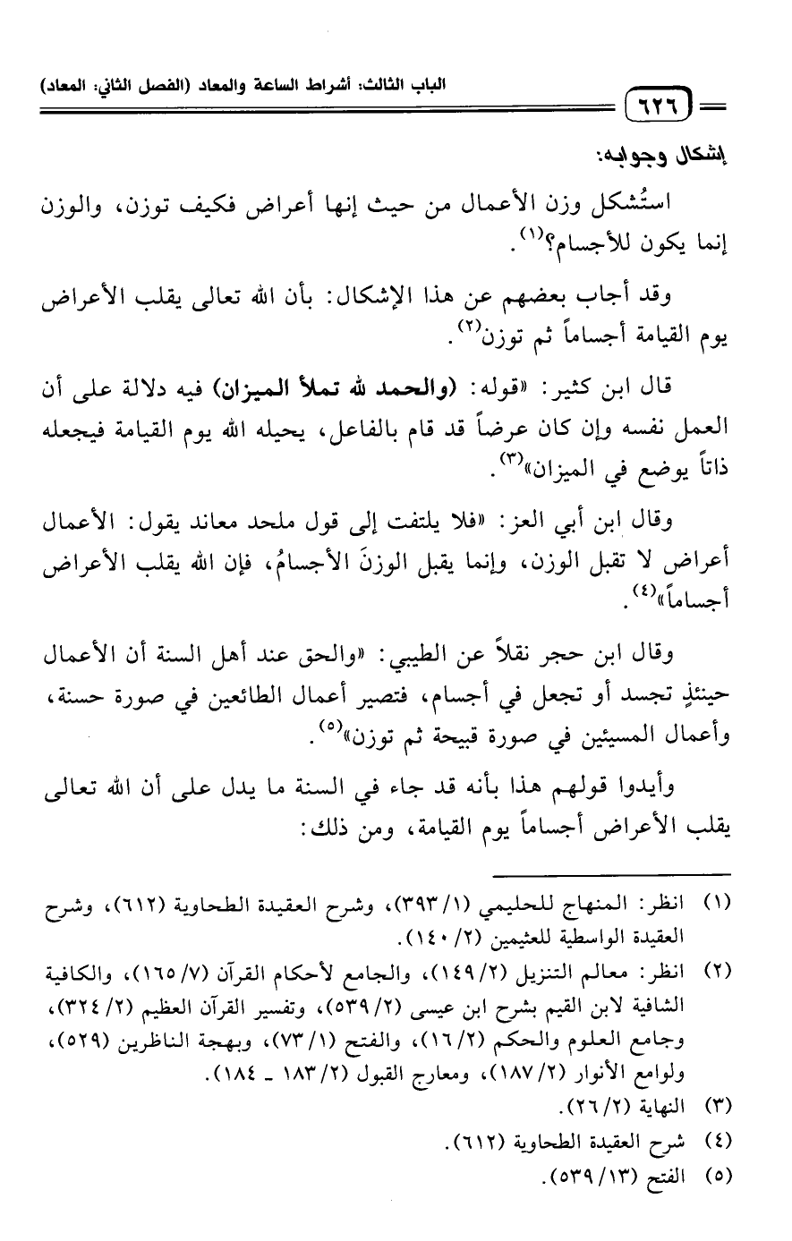 وقال ابن حجر نقلًا عن الطيبي: "والحق عند أهل السنة أن الأعمال حينئذٍ تجسد أو تجعل في أجسام، فتصير أعمال الطائعين في صورة حسنة، وأعمال المسيئين في صورة قبيحة ثم توزن" (¬٥).