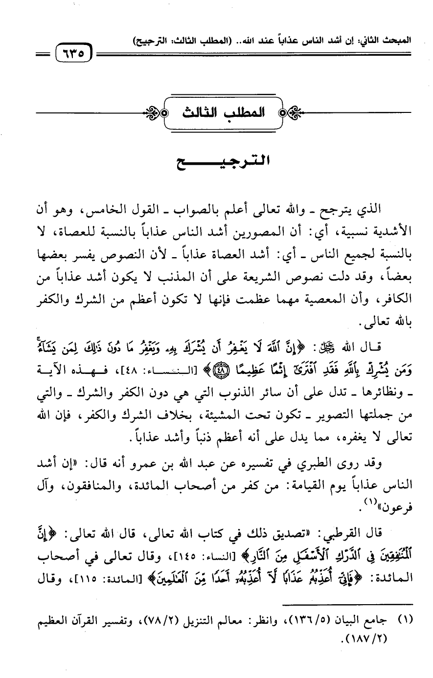 وقد روى الطبري في تفسيره عن عبد الله بن عمرو أنه قال: "إن أشد الناس عذابًا يوم القيامة: من كفر من أصحاب المائدة، والمنافقون، وآل فرعون" (¬١).