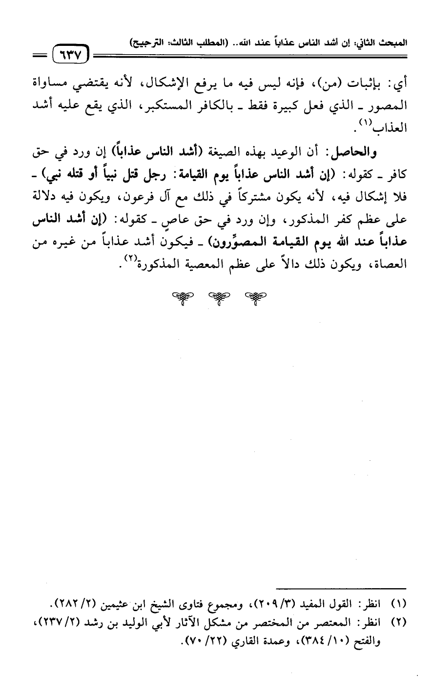 والحاصل: أن الوعيد بهذه الصيغة (أشد الناس عذابًا) إن ورد في حق كافر-كقوله: (إن أشد الناس عذابًا يوم القيامة: رجل قتل نبيًا أو قتله نبي) - فلا إشكال فيه، لأنه يكون مشتركًا في ذلك مع آل فرعون، ويكون فيه دلالة على عظم كفر المذكور، وإن ورد في حق عاصٍ -كقوله: (إن أشد الناس عذابًا عند الله يوم القيامة المصَّورون) -فيكون أشد عذابًا من غيره من العصاة، ويكون ذلك دالًا على عظم المعصية المذكورة (¬٢).