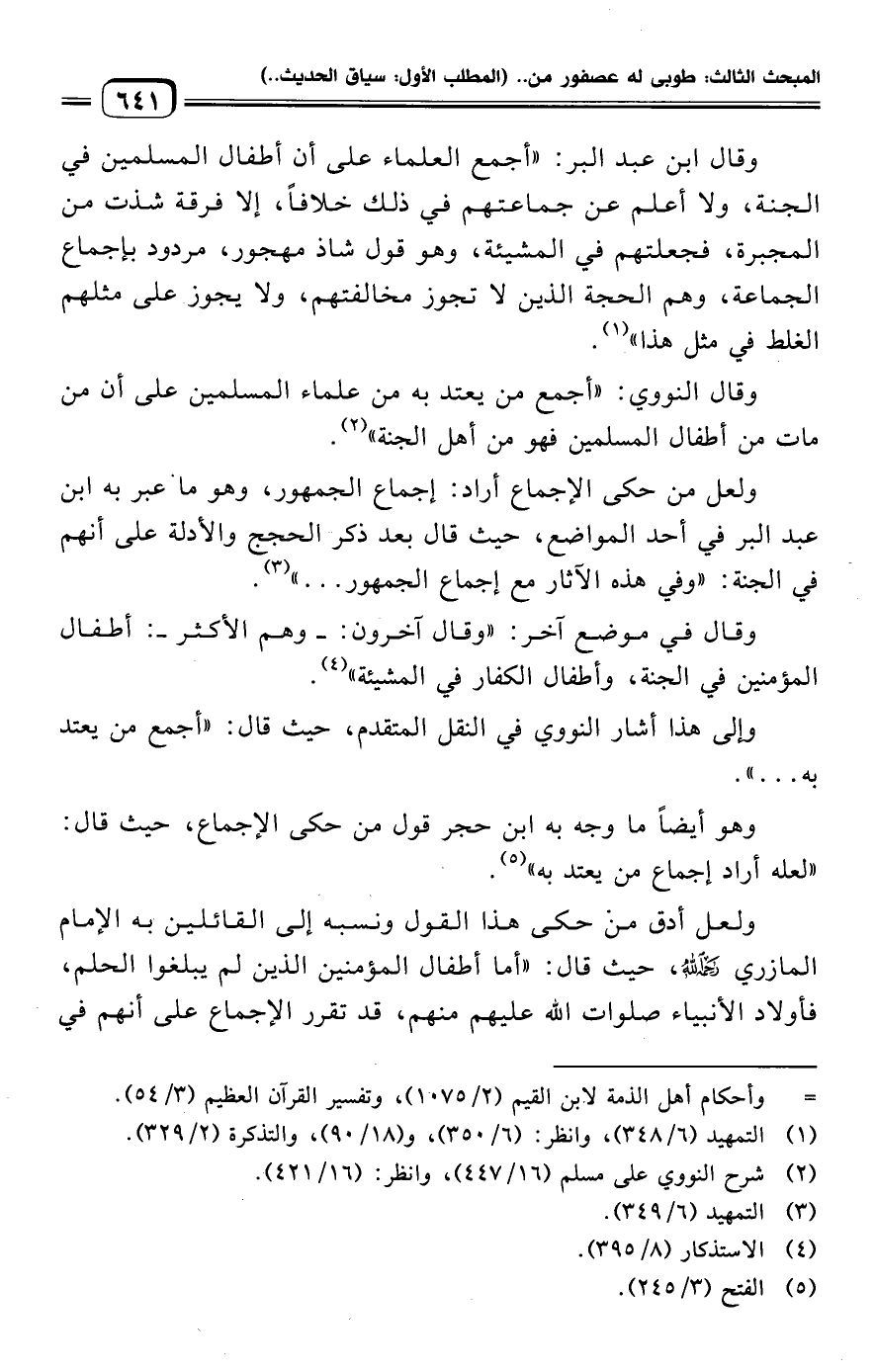 وقال ابن عبد البر: "أجمع العلماء على أن أطفال المسلمين في الجنة، ولا أعلم عن جماعتهم في ذلك خلافًا، إلا فرقة شذت من المجبرة، فجعلتهم في المشيئة، وهو قول شاذ مهجور، مردود بإجماع الجماعة، وهم الحجة الذين لا تجوز مخالفتهم، ولا يجوز على مثلهم الغلط في مثل هذا" (¬١).